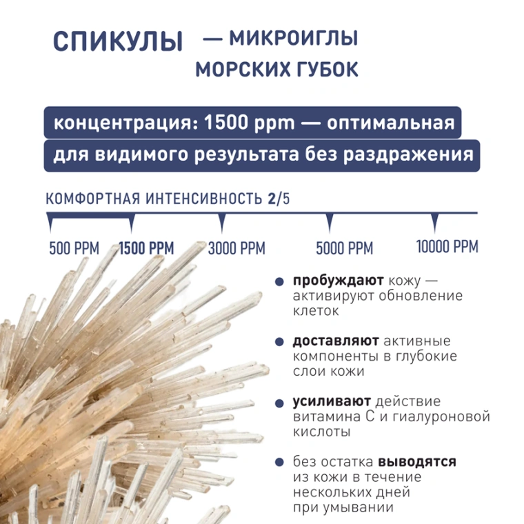 Ключевой компонент — спикулы (микроиглы), минеральные элементы из морских губок. Они мягко стимулируют кожу и усиливают проникновение активных веществ в глубокие слои эпидермиса, активизируя процессы обновления.