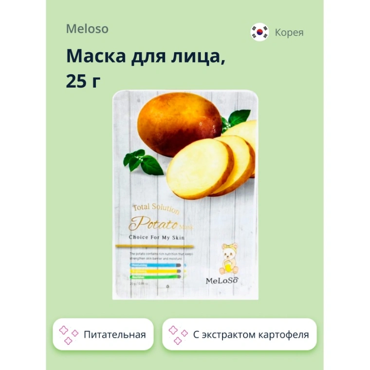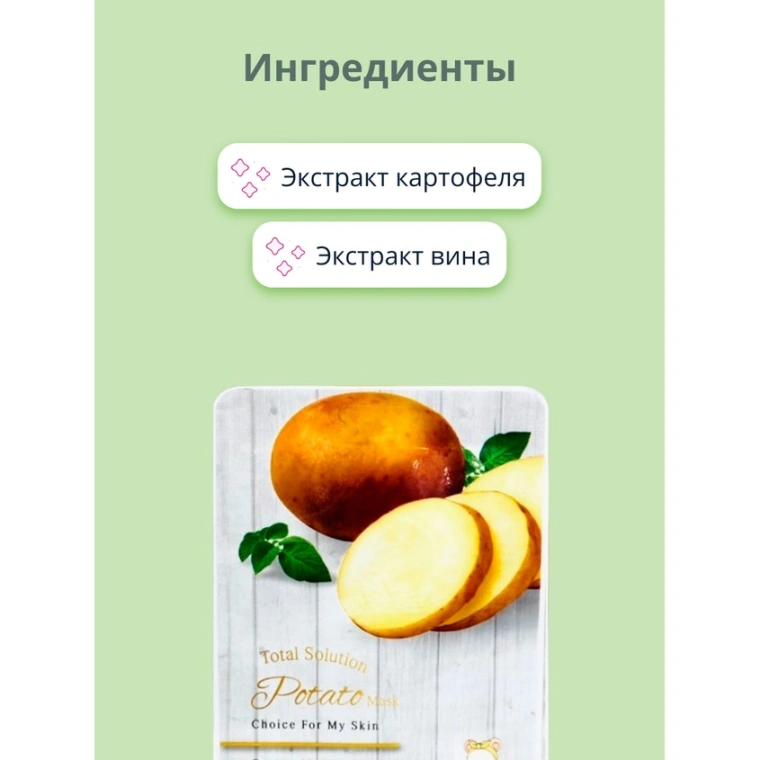 Тканевая маска действует по принципу восстанавливающего SPA ухода: глубоко питает, наполняет кожу влагой, стирает следы усталости, дарит коже свежий и отдохнувший вид! Экстракт картофеля мгновенно успокаивает и питает кожу, увлажняет и очищает ее, а также делает более упругой и эластичной. Экстракт вина, входящий в состав, способствует обновлению клеток и насыщает эпидермис витаминами, а также обладает тонизирующим действием. Все компоненты в составе маски интенсивно воздействуют на кожу, обеспечивая долговременный эффект увлажнения, устраняя ощущение стянутости и шелушение. Тканевая основа маски плотно прилегает к коже, повторяя все контуры лица, и способствует активному проникновению полезных компонентов в глубокие слои кожи.