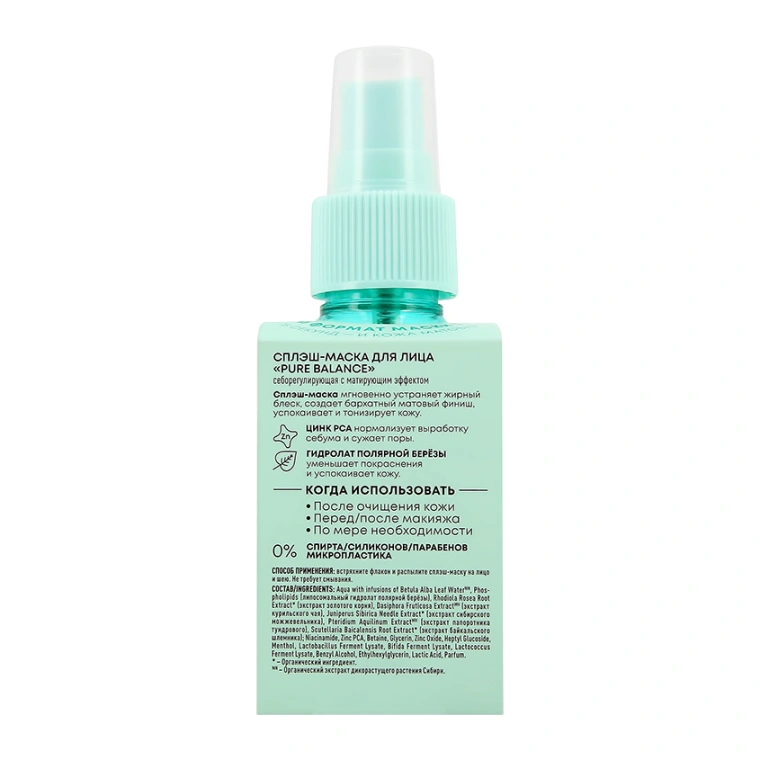 Сплеш-маска мгновенно устраняет жирный блеск, создает бархатный матовый финиш, успокаивает и тонизирует кожу.