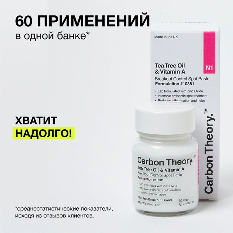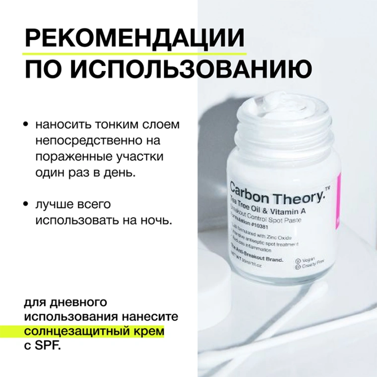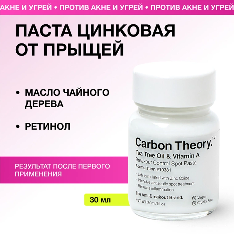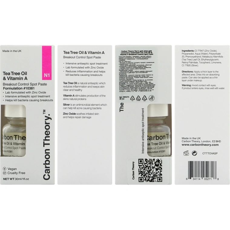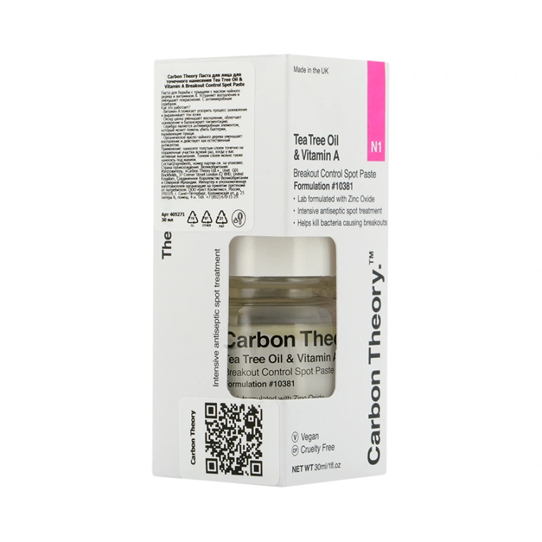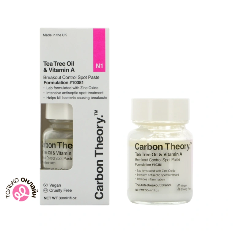 Паста для лица CARBON THEORY для точечного нанесения с маслом чайного дерева и витамином А направлена против воспалений. Дерматологически доказано, что лечебный состав оказывает интенсивное точечное воздействие на воспаление и является эффективным помощником в лечении угревой сыпи или локальных несовершенств.
