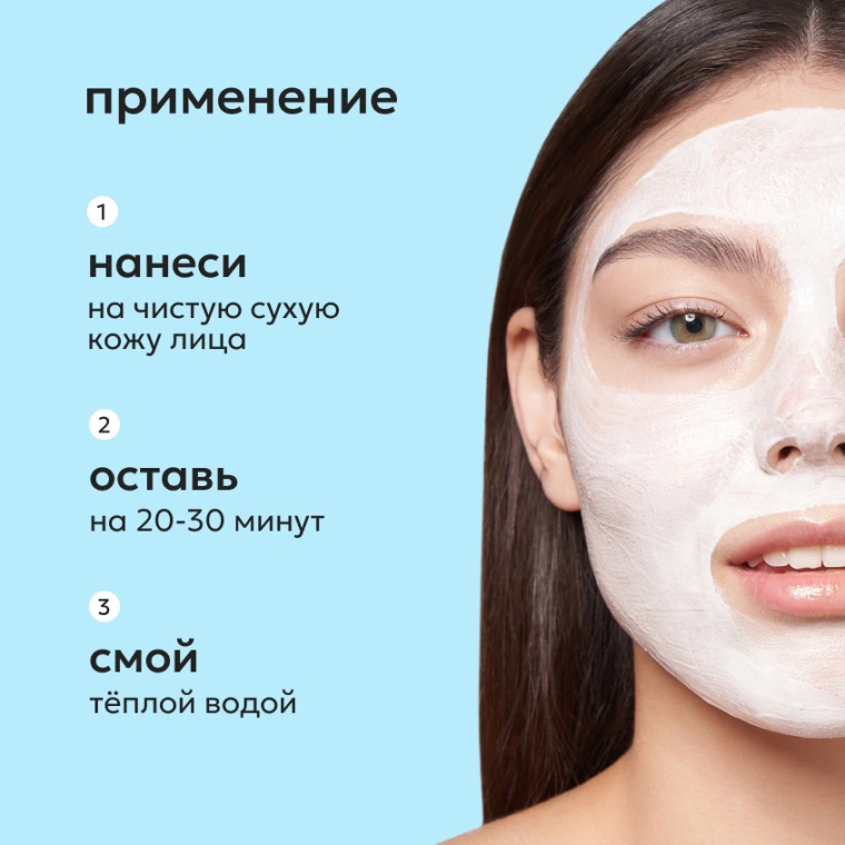 Способ применения: нанести маску равномерным слоем на предварительно очищенную кожу лица, избегая