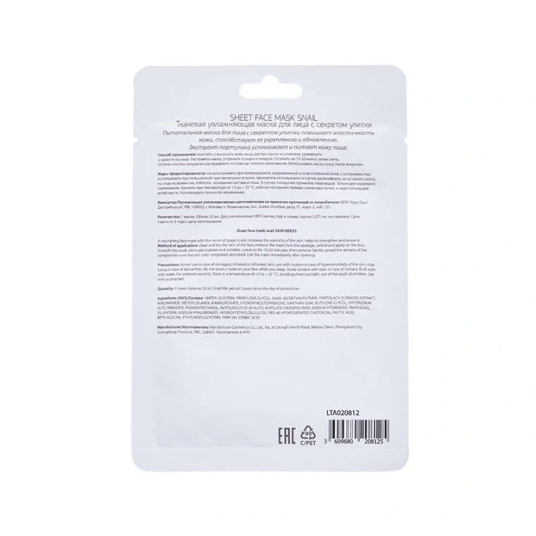 Маска для лица `SKIN NEEDS` с секретом улитки (увлажняющая) 23 мл