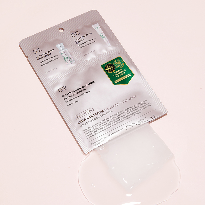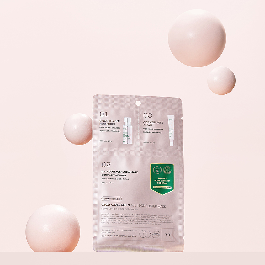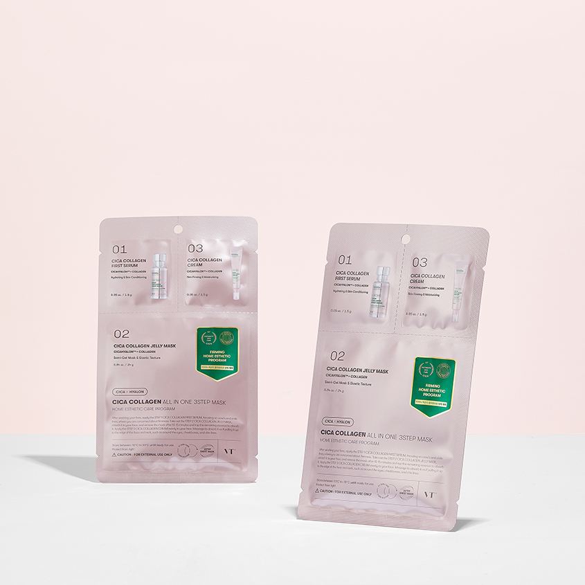 Трехступенчатая маска для лица VT Cica Collagen All In One с коллагеном укрепляет, успокаивает и делает кожу более упругой. Гиалуроновая кислота обеспечивает интенсивное увлажнение, а зеленый прополис усиливает антиоксидантную защиту. Пептиды сокращают мимические морщины, ускоряют восстановление, защищают и уменьшают негативное влияние УФ-лучей. Центелла азиатская снимает воспаления и уменьшает покраснения. Маска для лица VT Cica Collagen All In One выравнивает тон кожи и уменьшает отечность. Подходит для всех типов кожи, включая чувствительную.