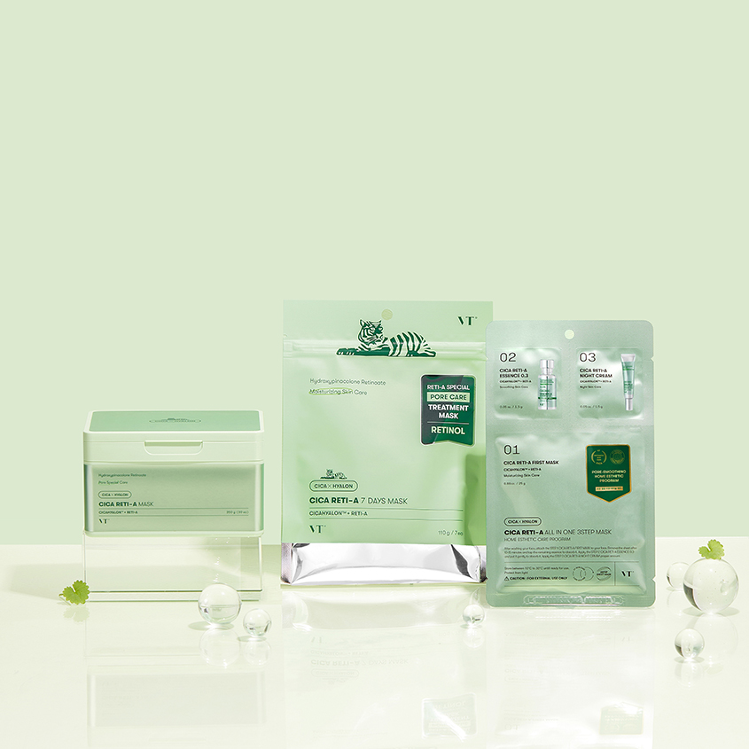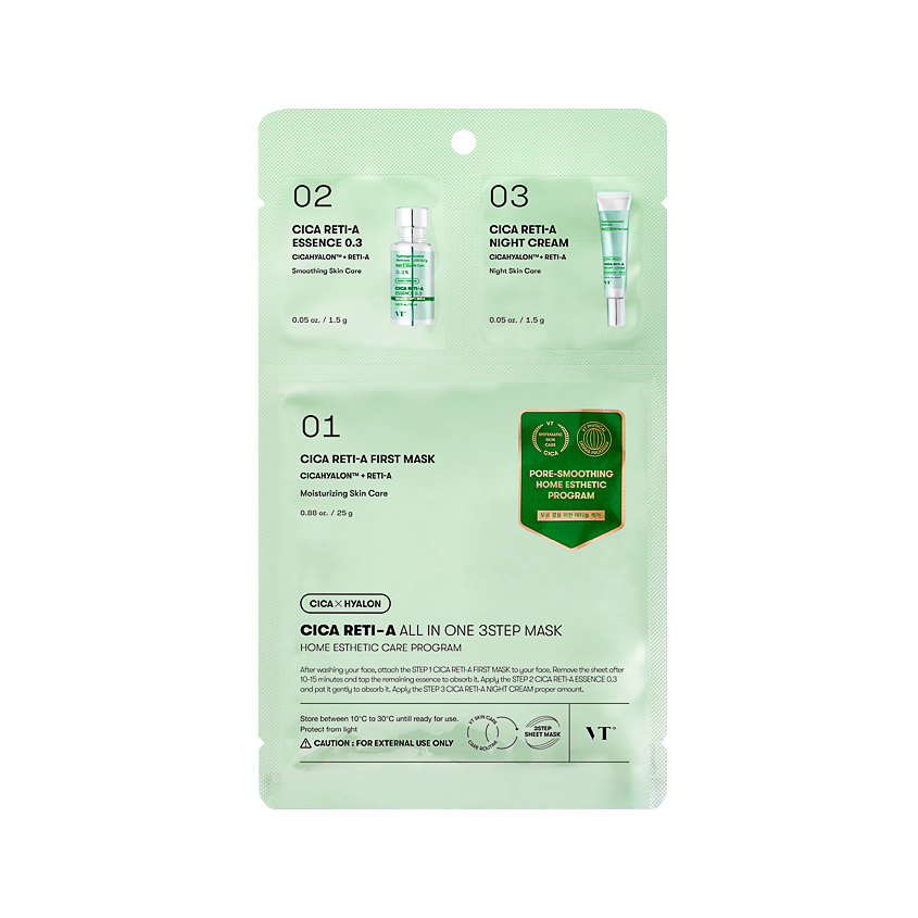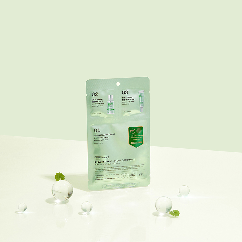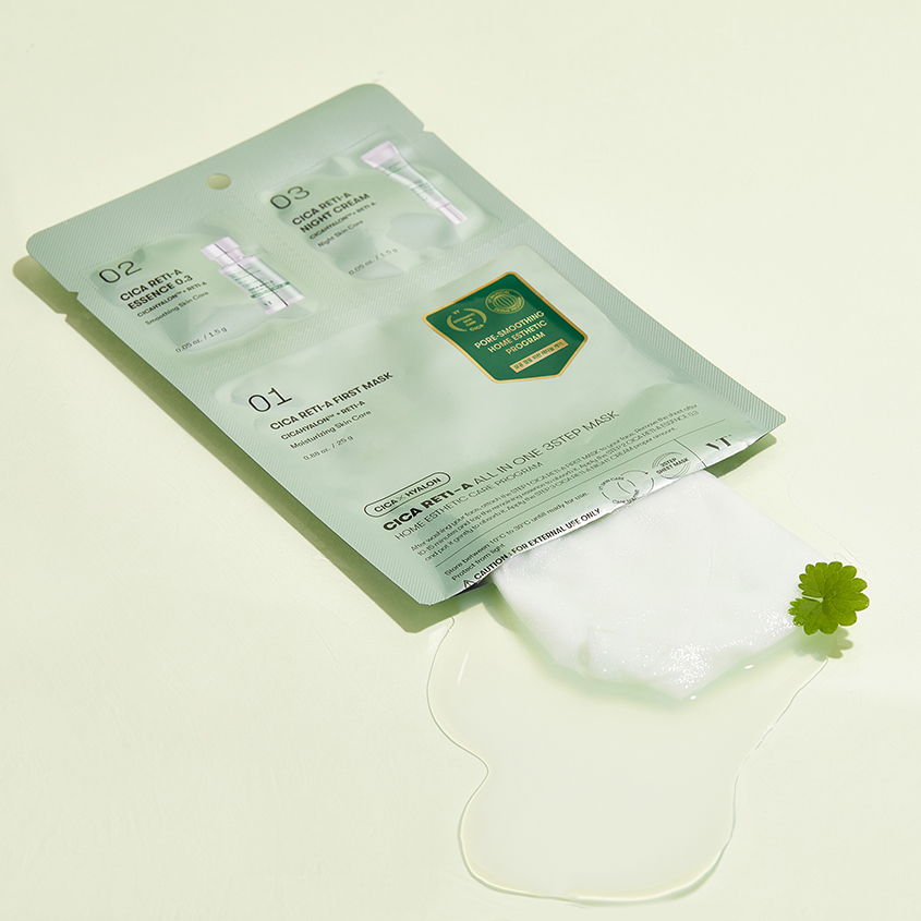 Трехступенчатая маска для лица VT Cica Reti-A All In One с ретинолом стимулирует обновление клеток, сокращает глубину морщин и улучшает текстуру кожи. Центелла азиатская успокаивает раздражения, ускоряет регенерацию. Ацетил гексапептид-8 стимулирует выработку коллагена, обеспечивает лифтинг-эффект. Бакучиол осветляет пигментацию и разглаживает, уменьшает морщины. Трехступенчатая маска для лица VT Cica Reti-A All In One мягко отшелушивает, осветляет сальные нити и сокращает видимость черных точек.