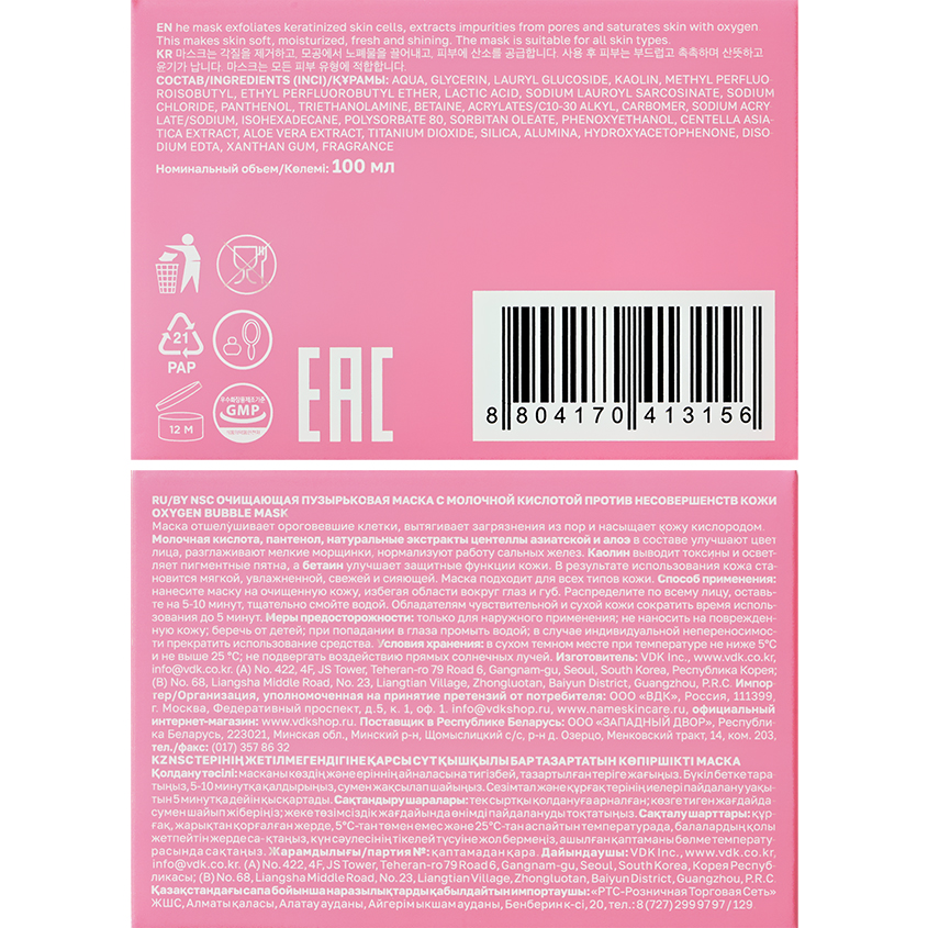 Маска отшелушивает ороговевшие клетки, вытягивает загрязнения из пор и насыщает кожу кислородом. Молочная кислота, пантенол, натуральные экстракты центеллы азиатской и алоэ в составе улучшают цвет лица, разглаживают мелкие морщинки, нормализуют работу сальных желез. Каолин выводит токсины и уменьшает выраженность пигментных пятен, а бетаин улучшает защитные функции кожи. В результате использования кожа становится мягкой, увлажненной, свежей и сияющей. Маска подходит для всех типов кожи.