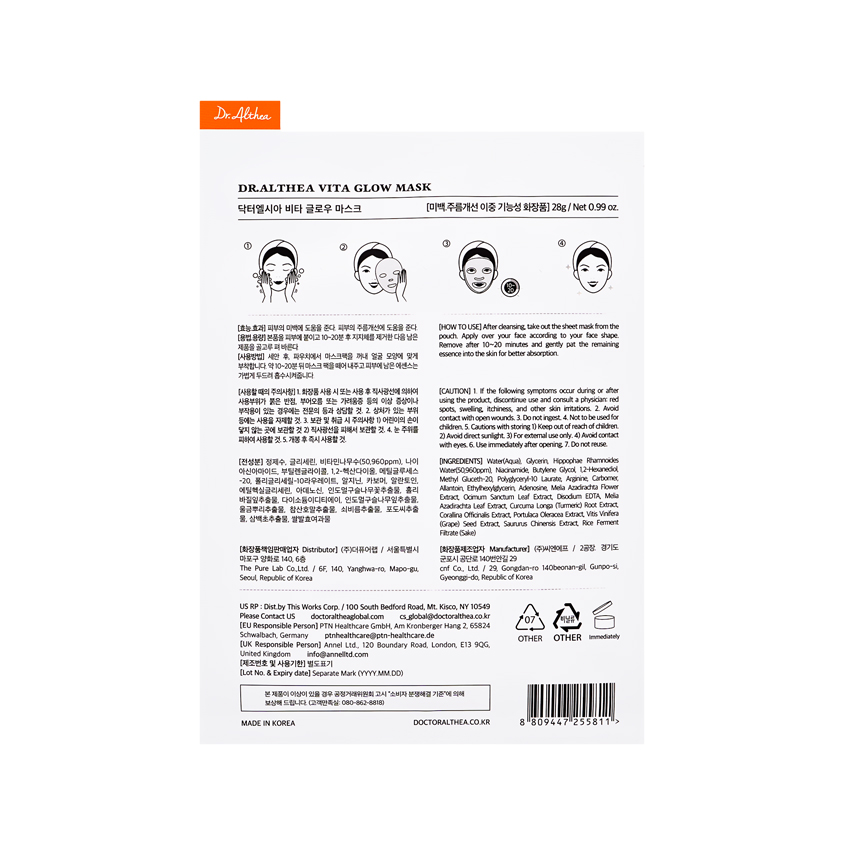 Маска для лица `DR. ALTHEA` Vita Glow выравнивает тон кожи, придавая ей сияние и уменьшая пигментацию. Содержит воду облепихи крушиновидной, богатую натуральным витамином C и другими питательными веществами, которые увлажняют и улучшают общий тон кожи