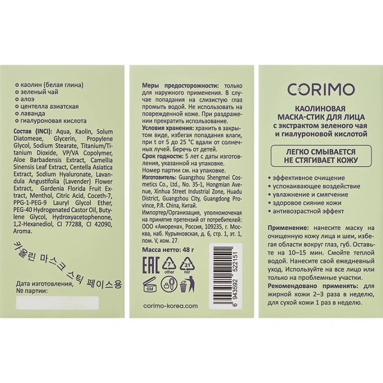 Каолиновая маска-стик для лица с экстрактом зеленого чая и гиалуроновой кислотой деликатно и тщательно очищает кожу лица и шеи от остатков макияжа, внешних загрязней, излишков кожного себума. Благодаря удобному флакону маска легко наносится и равномерно распределяется по коже, при этом руки остаются абсолютно чистыми. Белая глина - каолин оказывает мягкое эффективное очищающее действие, сужает поры, при этом не стягивает кожу и не трескается. Гиалуроновая кислота и экстракты зеленого чая, алоэ вера, ромашки, лаванды, гардении глубоко увлажняют, смягчают, разглаживают и восстанавливают кожу, дарят коже естественное здоровое сияние и ровный тон. Каолиновая маска-стик для лица с экстрактом зеленого чая и гиалуроновой кислотой имеет приятный зеленый цвет и подходит для всех типов кожи.