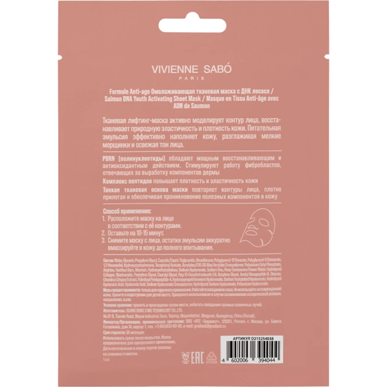 Омолаживающая тканевая маска с ДНК лосося SALMON DNA YOUTH ACTIVATING SHEET MASK от VIVIENNE SABÓ моделирует контур лица, восстанавливает природную эластичность и плотность кожи. Питательная эмульсия разглаживает мелкие морщинки и улучшает тон лица всего за одно применение.