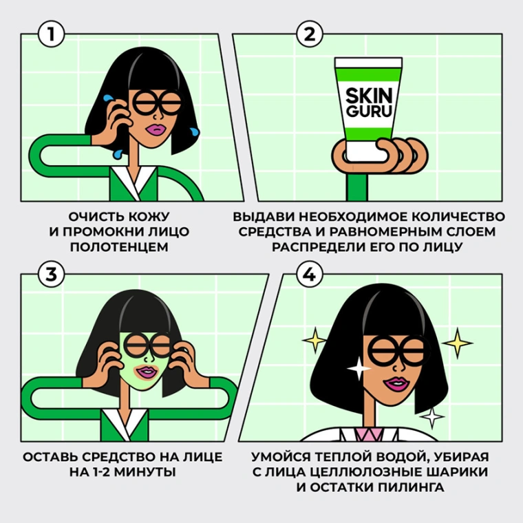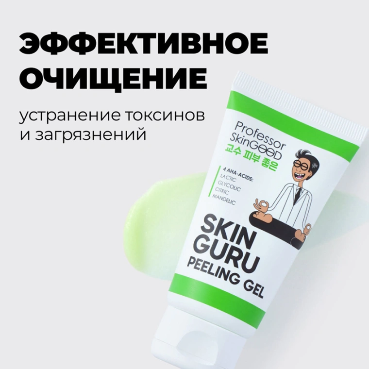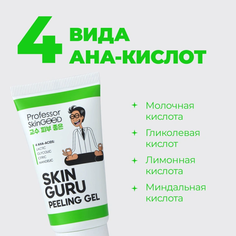 Пилинг для лица SKIN GURU PEELING GEL от Professor SkinGOOD (Профессор Скингуд) с AHA-кислотами деликатно отшелушивает и обновляет кожу. Молочная кислота в основе пилинг скатке - фруктовая кислота, которая отлично отшелушивает. Регулярное использование кислотного пилинга поможет сузить поры, уменьшить воспаления, отбелить пигментные пятна, сгладить неглубокие шрамы и рубцы на коже. Гликолевая кислота снижает уровень pH в роговом слое и запускает процесс образования новых молодых клеток. Обновившись, кожа выглядит свежей и чистой, а ее рельеф становится ровным. Лимонная кислота разрушает белковые связи между «живыми» и «мертвыми» клетками эпидермиса, отчего кожа становится чистой, гладкой и сияющей. Косметические средства с лимонной кислотой помогают освежить цвет лица, устранить мелкие морщинки, неглубокие шрамы и пигментные пятна. Миндальная кислота помогает осветлить пигментные пятна, отшелушить, укрепить кожу и улучшить ее общее состояние, сокращает прыщи, уменьшает поверхностные морщины. Средства с миндальной кислотой подходят для любого типа кожи, потому что она не повышает чувствительность. В ассортименте 1 скатка для лица. СПОСОБ ПРИМЕНЕНИЯ: Очистите кожу и промокните лицо полотенцем. Выдавите необходимое количество пилинга и равномерным слоем распределите его по лицу, избегая областей вокруг глаз и губ. Оставьте средство на лице на 1-2 минуты. Подушечками пальцев начните легко массировать кожу круговыми движениями в течение 1-2 минут. Вы увидите, что пилинг-скатка работает, когда под пальцами начнут образовываться катышки. Умойтесь теплой водой, убирая с лица целлюлозные шарики и остатки пилинга. Рекомендуем использовать пилинг 1-3 раза в неделю, в зависимости от типа кожи. Подходит для всех типов кожи, кроме чувствительной. После использования пилинг скатки рекомендуем тонизировать кожу тоником для лица ""A-HA! POWER ACIDS TONER"" и использовать сыворотку для лица ""HYALURON-TO-GO! MOIST SERUM"" от Professor SkinGOOD.