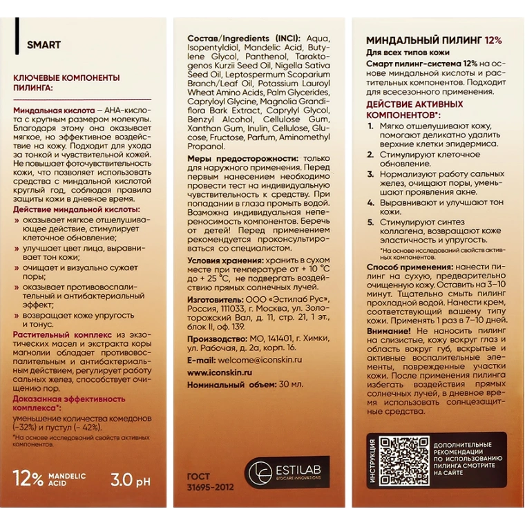 Смарт пилинг-система 12% на основе миндальной кислоты и растительных компонентов. Подходит для всесезонного применения. ДЕЙСТВИЕ: 1)Мягко отшелушивает кожу, помогает деликатно удалить верхние клетки эпидермиса. 2)Ускоряют регенерацию кожи. 3)Нормализуют работу сальных желез, очищают поры, уменьшают проявления акне. 4)Выравнивают и улучшают тон кожи. 5)Стимулируют синтез коллагена, возвращают коже эластичность и упругость. РЕЗУЛЬТАТ: безукоризненно чистая, гладкая и сияющая кожа. СПОСОБ ПРИМЕНЕНИЯ. Нанести пилинг на сухую, предварительно очищенную кожу. Оставить на 3–10 минут (первое применение 3 минуты). Тщательно смыть пилинг прохладной водой и нанести крем. Применять 1 раз в 7–10 дней. В процессе экспозиции возможно легкое покраснение и ощущение покалывания. При появлении жжения и сильном покраснении смыть средство прохладной водой. Не наносить на слизистые, кожу вокруг глаз и область вокруг губ, воспалительные элементы, поврежденные участки кожи.
