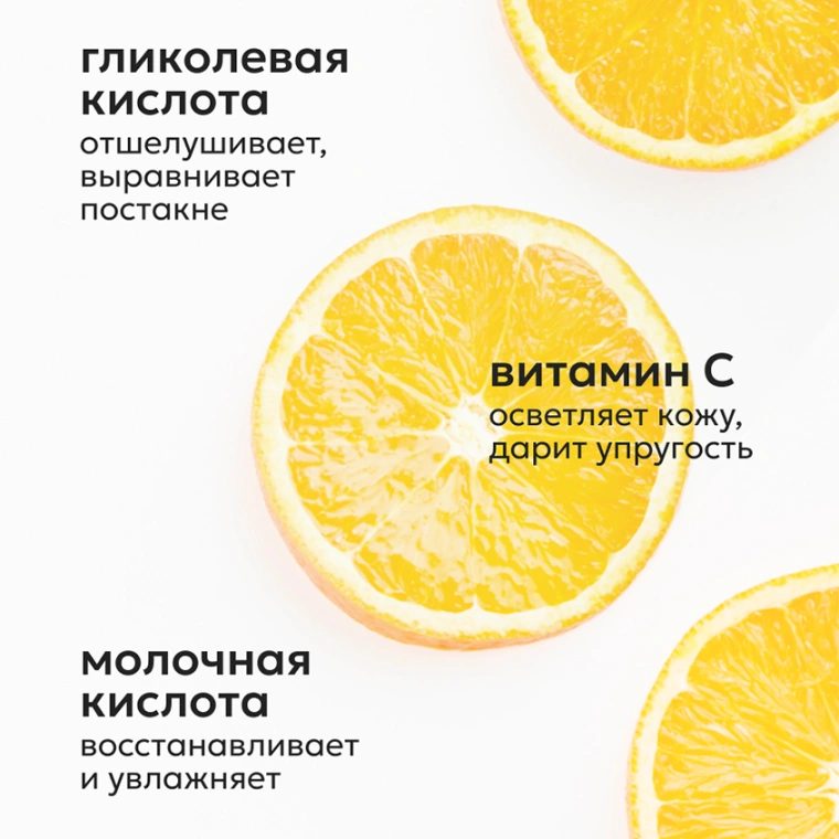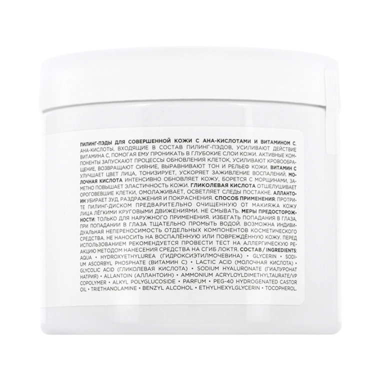 Пилинг-пэды для совершенной кожи с АНА-кислотами и витамином С. AНА-кислоты, входящие в состав пилинг-пэдов, усиливают действие витамина С, помогая ему проникать в глубокие слои кожи. Активные компоненты запускают процессы обновления клеток, усиливают кровообращение, возвращают сияние, выравнивают тон и рельеф кожи. Витамин С улучшает цвет лица, тонизирует, ускоряет заживление воспалений. Молочная кислота интенсивно обновляет кожу, борется с морщинами, заметно повышает эластичность кожи. Гликолевая кислота отшелушивает ороговевшие клетки, омолаживает, осветляет следы постакне. Аллантоин убирает зуд, раздражения и покраснения.