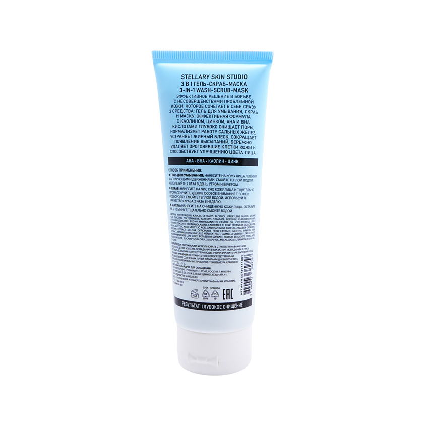 Эффективный продукт от несовершенств проблемной кожи, который сочетает в себе сразу три средства: гель для умывания, скраб и маску.