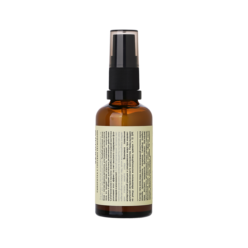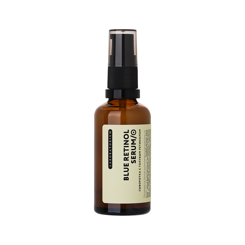 Эта сыворотка, богатая увлажняющими компонентами, подойдет для чувствительной кожи. Голубой ретинол (ланаблю) - мягкая форма ретинола, улучшающая синтез коллагена, он придает коже упругость, сокращает мимические морщины и обладает длительным увлажняющим действием. Сочетание алоэ с маслами жожоба и виноградной косточки усиливает этот эффект за счет высокого содержания флавоноидов и аминокислот.