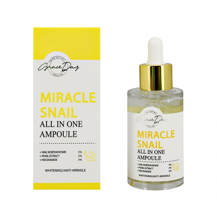Скажи “Hello!” гладкой и увлажнённой коже! Сыворотка для лица GRACE DAY с насыщенной формулой наполняет клетки влагой и совершенствует рельеф кожи «изнутри». Муцин улитки активно регенерирует и восстанавливает кожу, а также стимулирует активность фибропластов, отвечающих за производство коллагеновых и эластиновых волокон, обеспечивая тем самым видимый anti-age эффект. Входящие в состав экстракт жемчуга и ниацинамид бережно отшелушивают омертвевшие клетки, интенсивно увлажняют кожу и придают здоровое сияние. Благодаря комплексу грамотно подобранных активных компонентов сыворотка проникает в самые глубокие слои эпидермиса, активирует процесс восстановления клеток, насыщая их всеми необходимыми элементами для сохранения жизненного тонуса.
