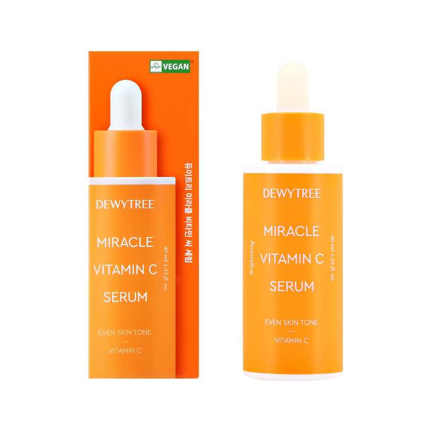 Выравнивающая сыворотка для лица DEWYTREE Miracle с витамином С подарит красоту, молодость и сияние вашей коже! Формула интенсивного действия с 39% концентрацией витамина С (экстракт облепихи) выравнивает тон лица, придает сияние и повышает тонус. Гиалуроновая кислота в комплексе с экстрактами розмарина и куркумы надолго удерживает влагу в коже, обеспечивая эффект моментального увлажнения и совершенствуя рельеф «изнутри». Легкая текстура корейской сыворотки DEWYTREE быстро впитывается и приятно освежает кожу при нанесении.