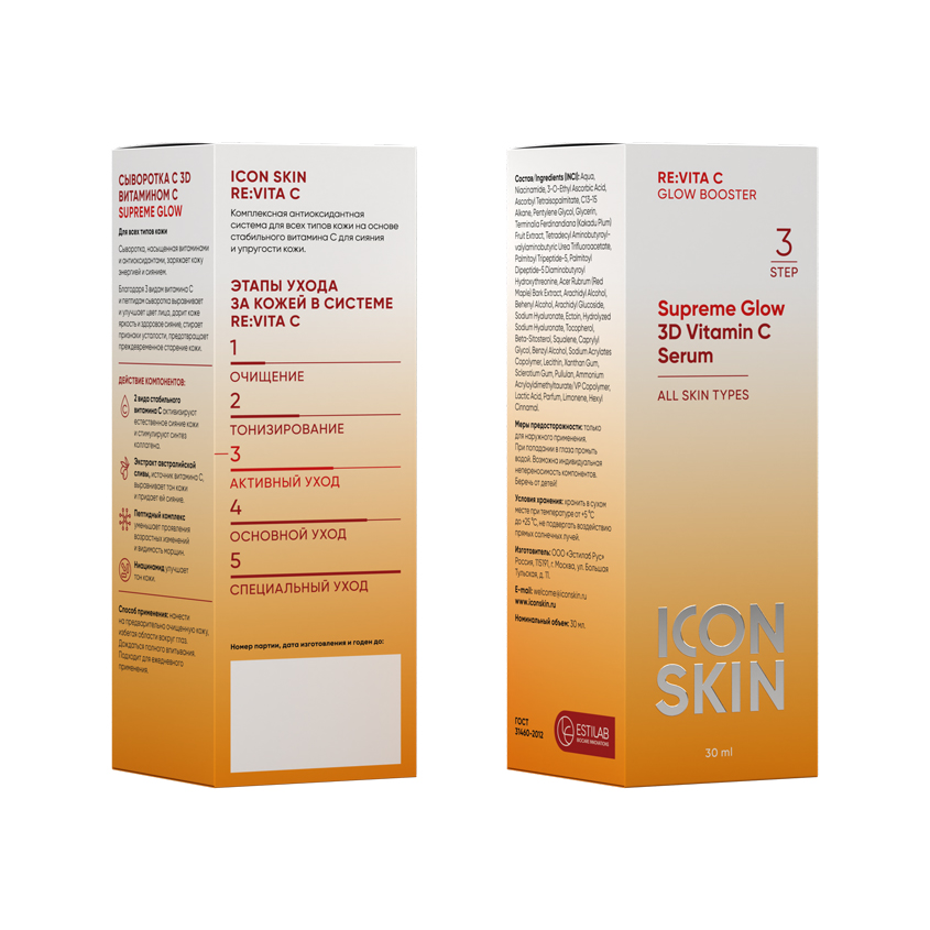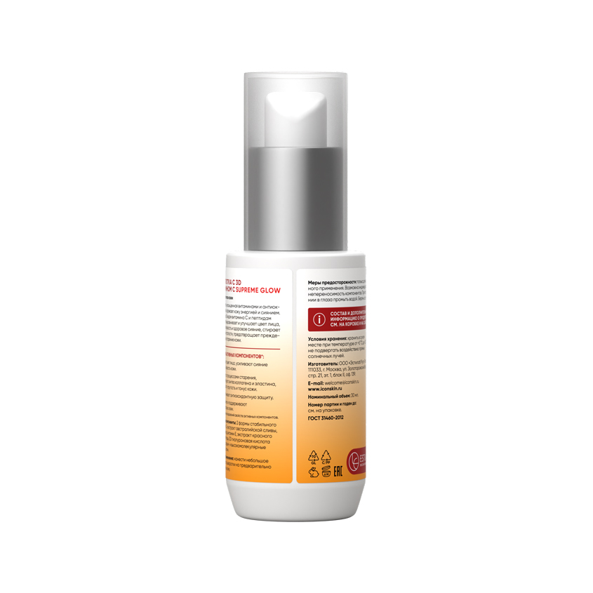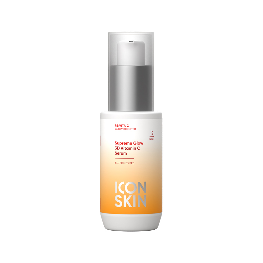 Сыворотка с 3D витамином С – насыщенный антиоксидантами витаминный коктейль, заряжающий кожу энергией и сиянием. Благодаря 3 видам витамина С и пептидам сыворотка выравнивает и улучшает цвет лица, дарит коже яркость и здоровое сияние, стирает признаки усталости, предотвращает преждевременное старение кожи. 2 формы стабильного витамина С борются с окислительным стрессом, стимулируют синтез коллагена и выравнивают тон кожи. Экстракт австралийской сливы, богатейший природный источник витамина С, усиливает сияние (+30%) и яркость кожи. Уменьшает выраженность морщин. ДЕЙСТВИЕ: 1)Улучшает цвет лица. 2)Борется с процессами старения, повышает упругость и тонус кожи. 3)Обеспечивает антиоксидантную защиту. 4)Увлажняет и поддерживает гидробаланс кожи. РЕЗУЛЬТАТ: кожа выглядит сияющей, яркой, упругой и эластичной. Для достижения максимального эффекта после применения сыворотки рекомендуется использовать крем из серии ICON SKIN RE:VITA C.