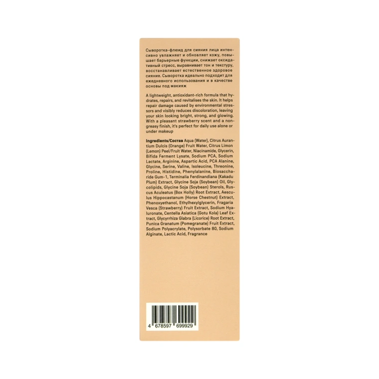 Aqua (Water), Citrus Aurantium Dulcis (Orange) Fruit Water, Citrus Limon (Lemon) Peel/Fruit Water, Niacinamide, Glycerin, Bifida Ferment Lysate, Sodium PCA, Sodium Lactate, Arginine, Aspartic Acid, PCA Alanine, Glycine, Serine, Valine, Isoleucine, Threonine, Proline, Histidine, Phenylalanine, Biosaccharide Gum-1, Terminalia Ferdinandiana (Kakadu Plum) Extract, Glycine Soja (Soybean) Oil, Glycolipids, Glycine Soja (Soybean) Sterols, Ruscus Aculeatus (Box Holly) Root Extract, Aesculus Hippocastanum (Horse Chestnut) Extract, Phenoxyethanol, Ethylhexylglycerin, Fragaria Vesca (Strawberry) Fruit Extract, Sodium Hyaluronate, Centella Asiatica (Gotu Kola) Leaf Extract, Glycyrrhiza Glabra (Licorice) Root Extract, Punica Granatum (Pomegranate) Fruit Extract, Sodium Polyacrylate, Polysorbate 80, Sodium Alginate, Lactic Acid, Fragrance