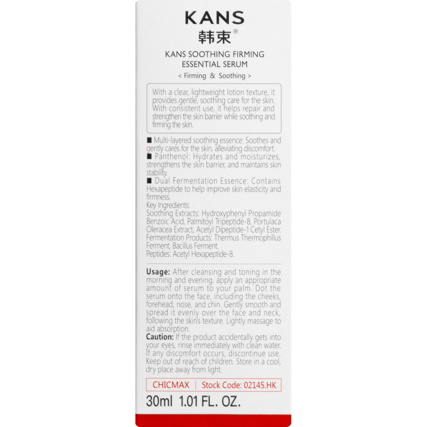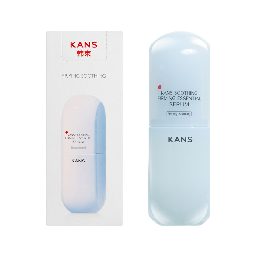 Сыворотка для лица KANS в голубом флаконе из линейки Soothing Firming Essential – концентрированное водно-кремовое средство для комплексного омоложения, укрепления и увлажнения чувствительной кожи лица с первыми признаками возрастных изменений (30+), мелкими мимическими морщинами, потерей упругости и сияния.