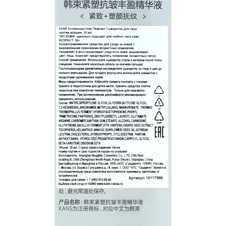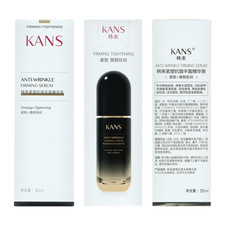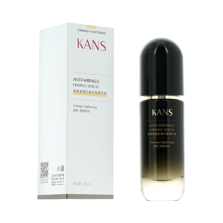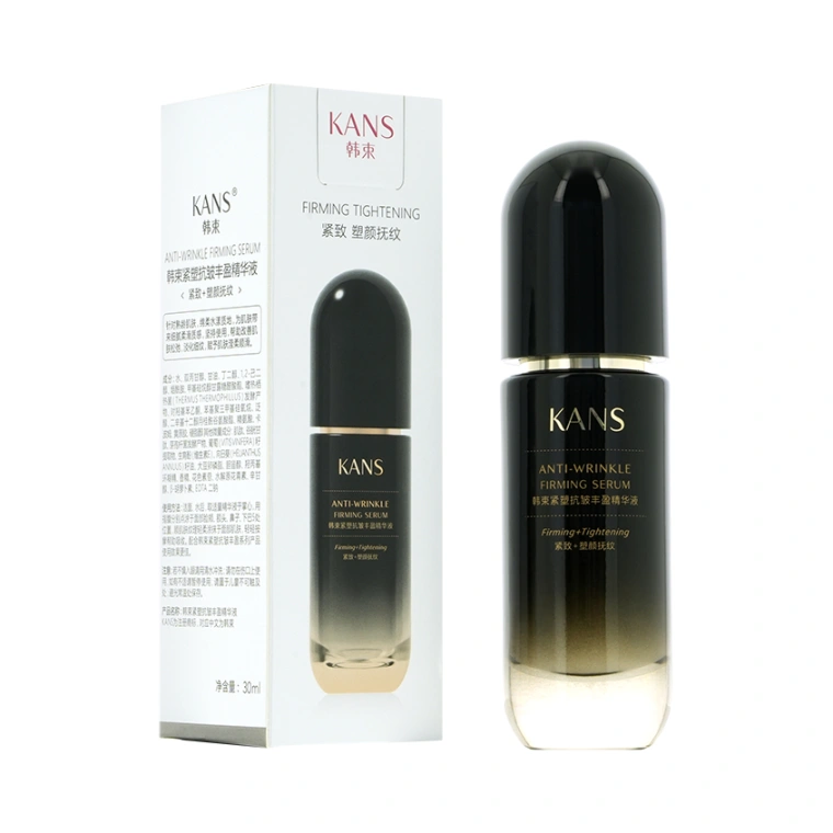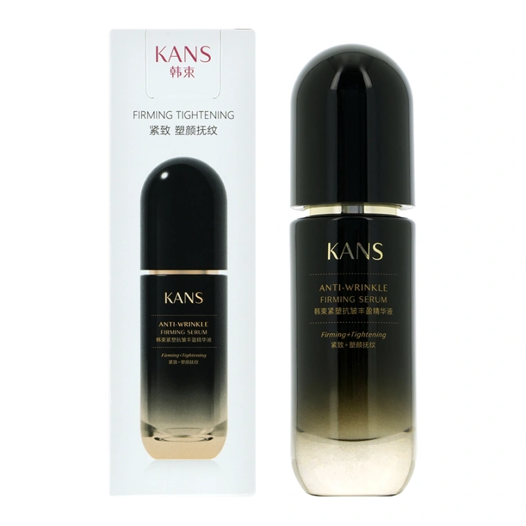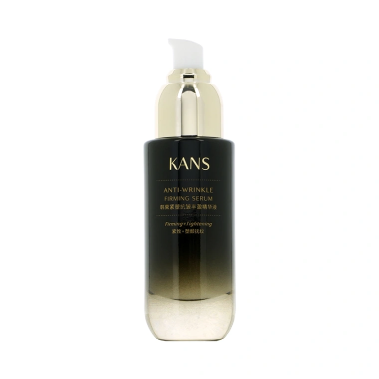 Сыворотка для лица KANS с ниацинамидом из чёрно-золотой линейки Anti-wrinkle Firming – концентрированное водно-кремовое средство для комплексного омоложения, увлажнения и усиленного восстановления упругости кожи (45+) с выраженными признаками возрастных изменений, пигментными пятнами и с неровным цветом лица.