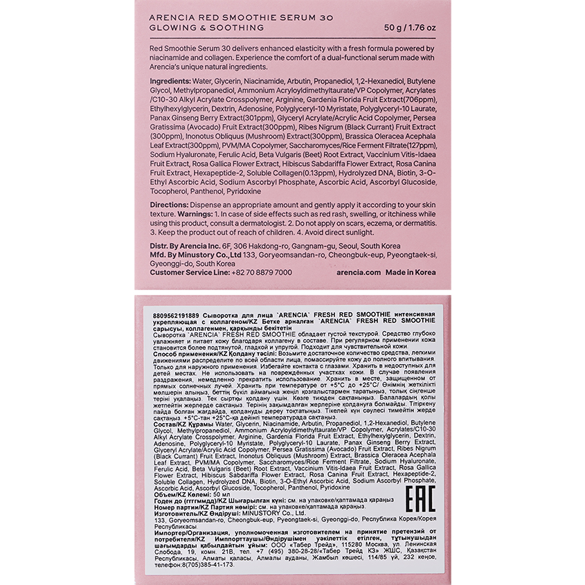Сыворотка для лица ARENCIA FRESH RED SMOOTHIE интенсивная укрепляющая с коллагеном — многофункциональное средство с нежной желеобразной текстурой, которое заменяет сразу два этапа ухода и может использоваться без крема. Она оказывает сосудоукрепляющее действие, препятствует проявлениям купероза, сужает расширенные поры и возвращает коже упругость. Формула с 30% комплекса RED COLLAGEN (экстракты женьшеня, авокадо, черной смородины и коллаген) повышает эластичность, стимулирует выработку коллагеновых и эластиновых волокон, разглаживает мимические морщины и сокращает их глубину. Сыворотка для лица ARENCIA FRESH RED SMOOTHIE осветляет постакне и пигментацию, защищает от фотостарения и оксидативного стресса, продлевая молодость кожи.