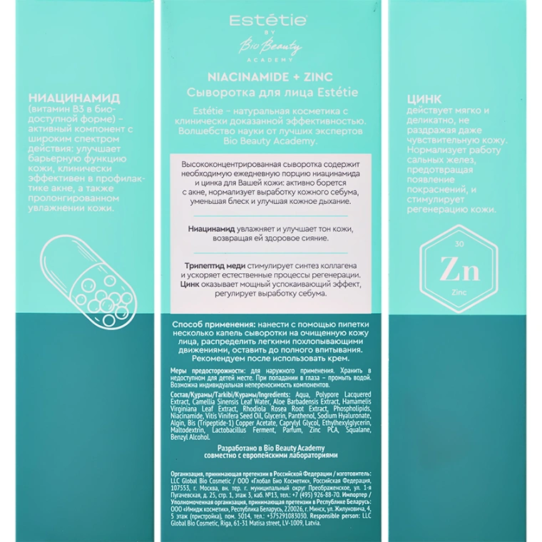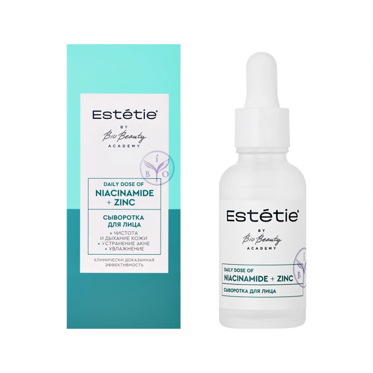 Estetie – экспертная косметика с клинически доказанной эффективностью от Bio Beauty Academy. Волшебство науки и сила природы для красоты Вашей кожи от лучших экспертов. Высококонцентрированная сыворотка cодержит необходимую ежедневную порцию ниацинамида и цинка для вашей кожи: активно борется с акне, нормализует выработку кожного себума, уменьшая блеск и улучшая кожное дыхание.