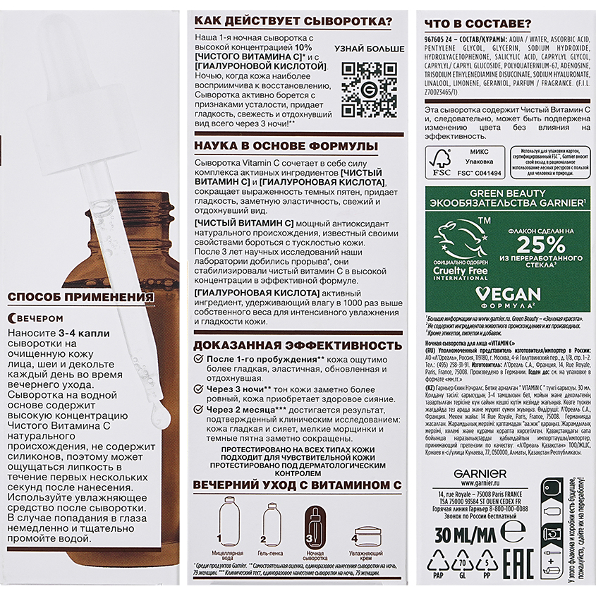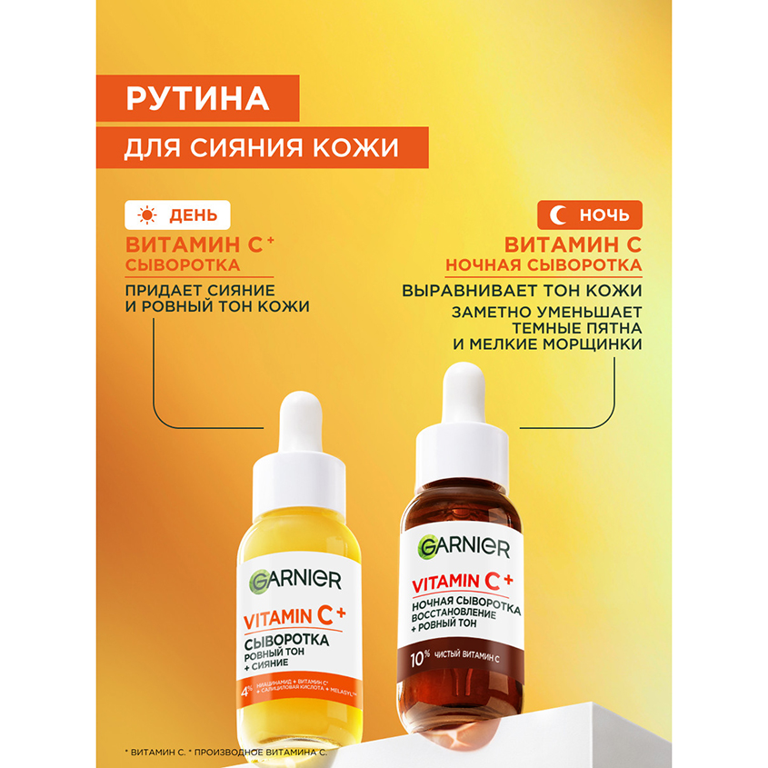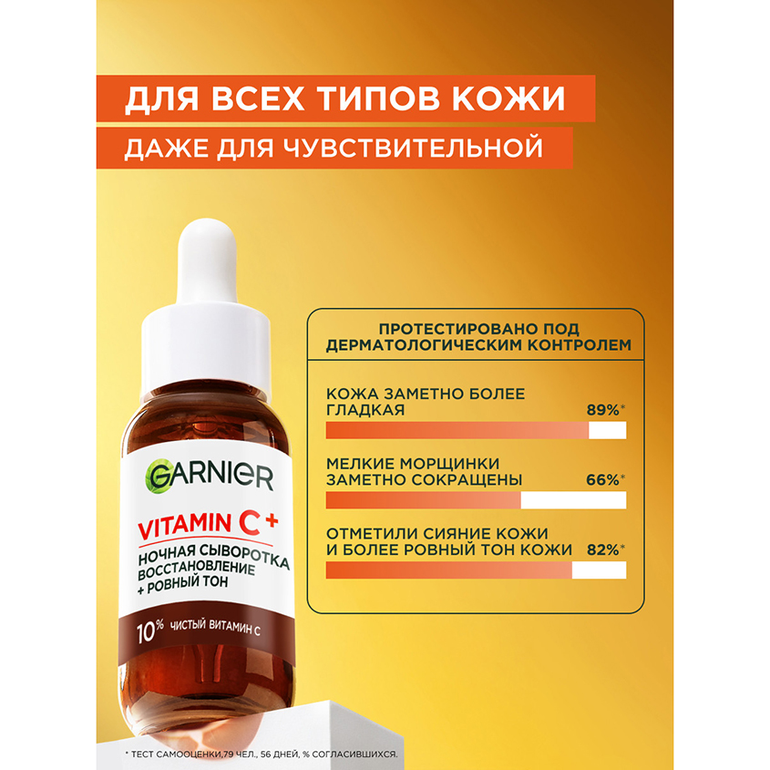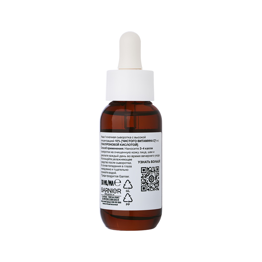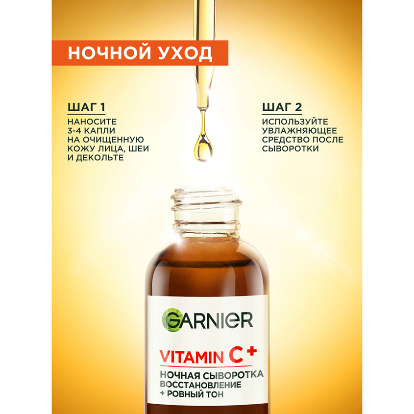 Ночная сыворотка для лица с Витамином С Garnier «Восстановление + Ровный тон» — это интенсивно восстанавливающий ночной уход для лица, который работает пока вы спите. Формула с высокой концентрацией чистого витамина С, с гиалуроновой кислотой и глицерином целенаправленно борется с тусклостью кожи, пигментными пятнами и первыми признаками старения. Сыворотка для лица подходит для всех типов кожи и предназначена для вечернего применения, обеспечивая коже заметное обновление и восстановление. После сыворотки рекомендуется нанести увлажняющее средство для лица.