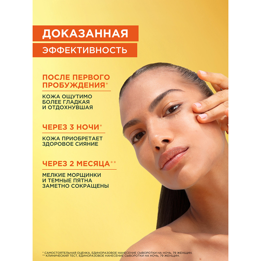 Сыворотка с витамином С дает результат уже после первого применения*: кожа при пробуждении ощущается более гладкой и отдохнувшей. Через 3 ночи* регулярного использования лицо приобретает заметно более ровный тон и здоровое сияние, а через 2 месяца** мелкие морщинки и пигментные пятна заметно уменьшаются.