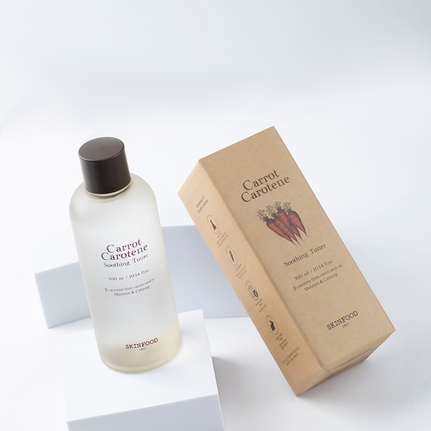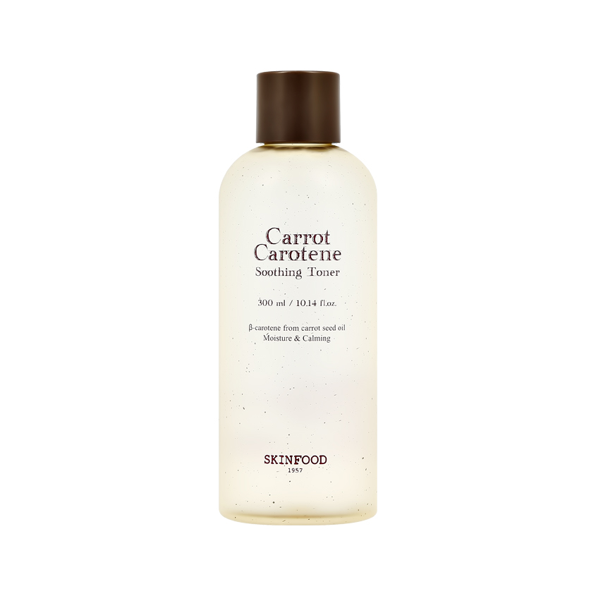 Успокаивающий тонер для лица SKINFOOD Carrot Carotene с экстрактом и маслом моркови — идеальное средство для ежедневного ухода за чувствительной кожей лица. Главный активный компонент — морковь (экстракт моркови, масло семян моркови), насыщенная бета-каротином и жирорастворимым витамином А, которая делает кожу более упругой, гладкой, выравнивает микрорельеф и возвращает здоровое сияние. Бета-каротин прекрасно успокаивает кожу и укрепляет защитный барьер эпидермиса, а также нормализуют pH-баланс. При регулярном применении корейского тонера вы заметите, как ваша кожа заметно преобразится!