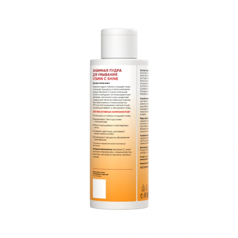 Энзимная пилинг-пудра для умывания начинает действовать при контакте с водой, превращаясь в мягкую пенку и активизируя очищающий энзимно-кислотный комплекс. Пудра глубоко очищает кожу и запускает процессы клеточной регенерации. Входящие в состав пудры витамин С и растительные экстракты обладают антиоксидантным действием, заряжают кожу энергией и возвращают ей естественное сияние. Фруктовые энзимы и глюконолактон (PHA-кислота) оказывают мягкий отшелушивающий эффект и обновляют кожу. Особенно рекомендуется для ухода за тусклой, утратившей сияние кожей. ДЕЙСТВИЕ: 1) Интенсивно и глубоко очищает кожу. 2) Выравнивает текстуру кожи и микрорельеф. 3) Мягко отшелушивает слой мертвых клеток. 4) Освежает цвет лица, усиливает сияние и яркость кожи. 5) Активизирует процессы обновления и регенерации. РЕЗУЛЬТАТ: безукоризненно чистая, гладкая и сияющая кожа. НЕ СОДЕРЖИТ: силиконов, парабенов, красителей. Рекомендуемая частота использования: 2-3 раза в неделю.