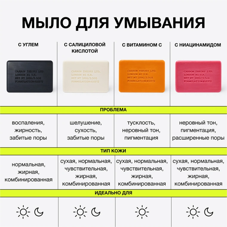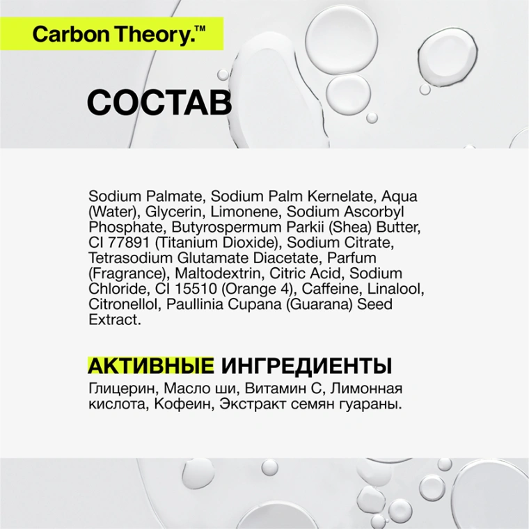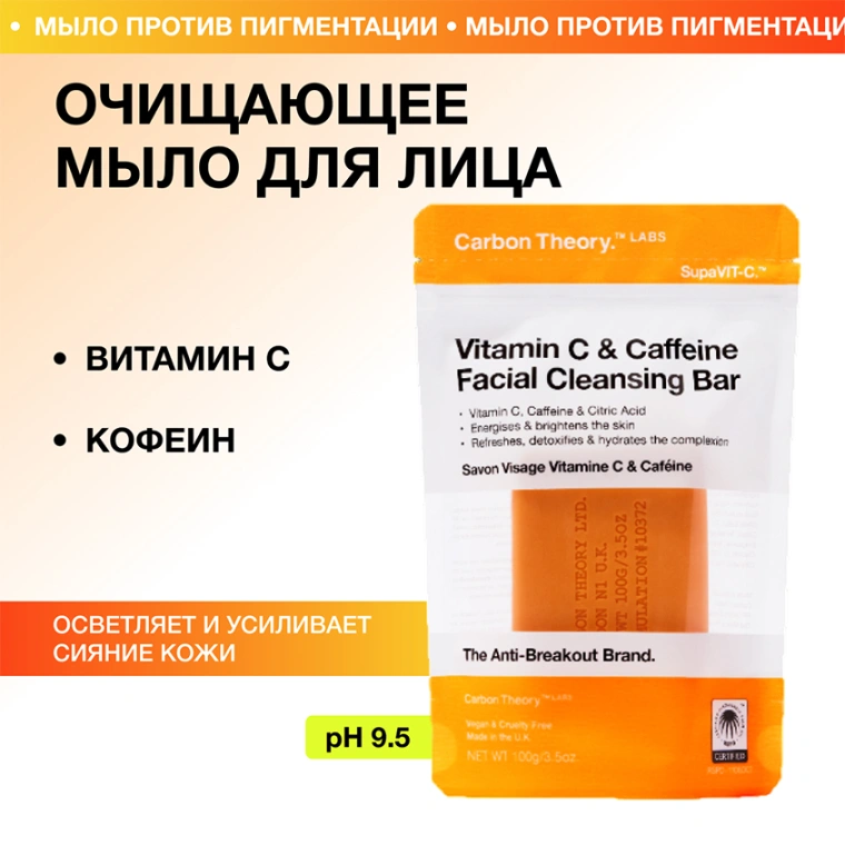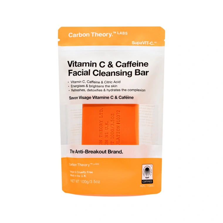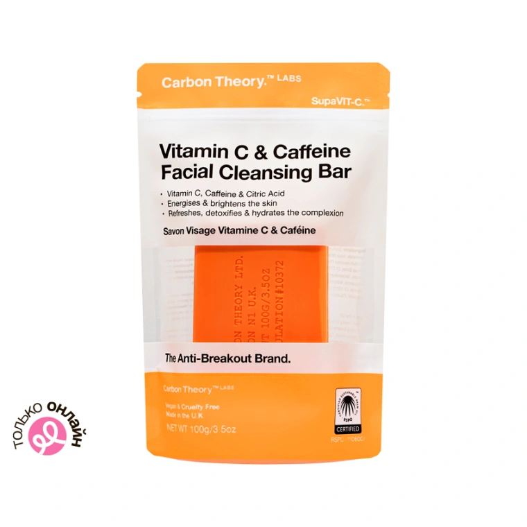 Мыло для лица CARBON THEORY Supavit-C с витамином C, кофеином и лимонной кислотой интенсивно увлажняет, осветляет и усиливает сияние кожи. Витамин С обладает осветляющими кожу свойствами, которые могут помочь предотвратить появление темных пятен и гиперпигментации. Кофеин помогает поддерживать здоровое сияние и заряжать кожу энергией, улучшая кровообращение. Лимонная кислота удаляет омертвевшие клетки кожи, ускоряет обновление клеток и эффективно борется с высыпаниями и пигментацией. Мыло CARBON THEORY выравнивает тон и тонизирует кожу.