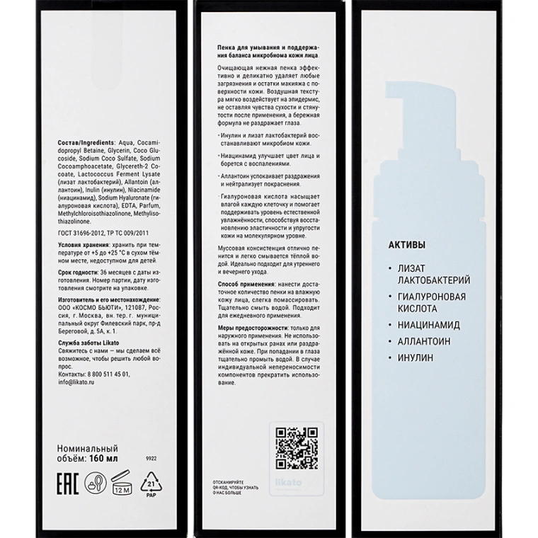 Очищающая нежная пенка эффективно и деликатно удаляет любые загрязнения и остатки макияжа с поверхности кожи. Воздушная текстура мягко воздействует на эпидермис, не оставляя чувства сухости и стянутости после применения, а бережная формула не раздражает глаза. Инулин и лизат лактобактерий восстанавливают микробиом кожи. Ниацинамид улучшает цвет лица и борется с воспалениями. Аллантоин успокаивает раздражения и нейтрализует покраснения. Гиалуроновая кислота насыщает влагой каждую клеточку и помогает поддерживать уровень естественной увлажнённости, способствуя восстановлению эластичности и упругости кожи на молекулярном уровне. Муссовая консистенция отлично пенится и легко смывается тёплой водой. Идеально подходит для утреннего и вечернего ухода.