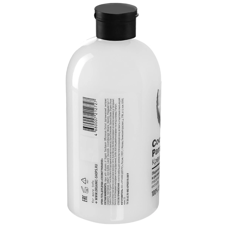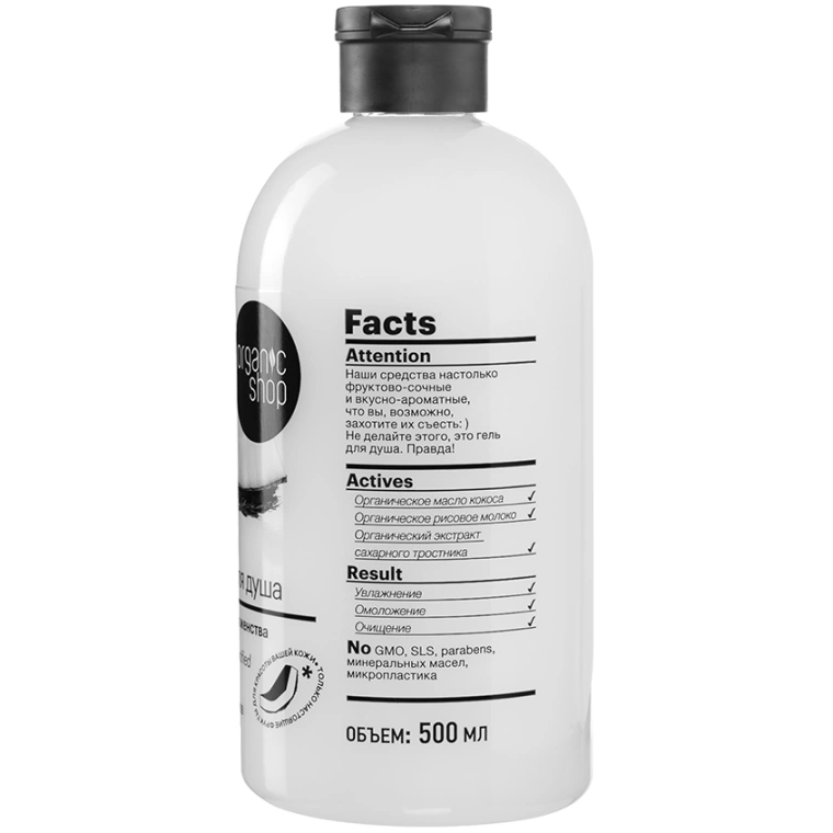 Aqua with infusions of Organic Saccharum Officinarum Extract (органический экстракт сахарного тростника); Sodium Coco-Sulfate, Lauryl Glucoside, Cocamidopropyl Betaine, Glycerin, Polyquaternium-7, Sodium Chloride, Organic Cocos Nucifera Oil (органическое масло кокоса), Glycol Distearate, Glyceryl Oleate, Organic Oryza Sativa Extract (органическое рисовое молоко), Citric Acid, Benzyl Alcohol (консервант из масла жасмина и гвоздики), Benzoic Acid (пищевой консервант из ягод брусники), Sorbic Acid (пищевой консервант из ягод клюквы), Parfum.