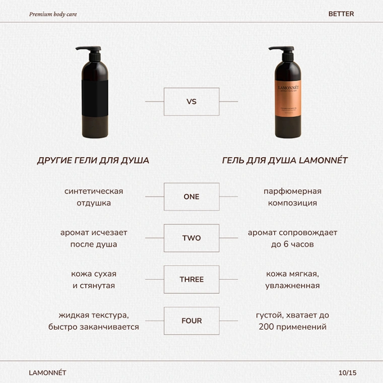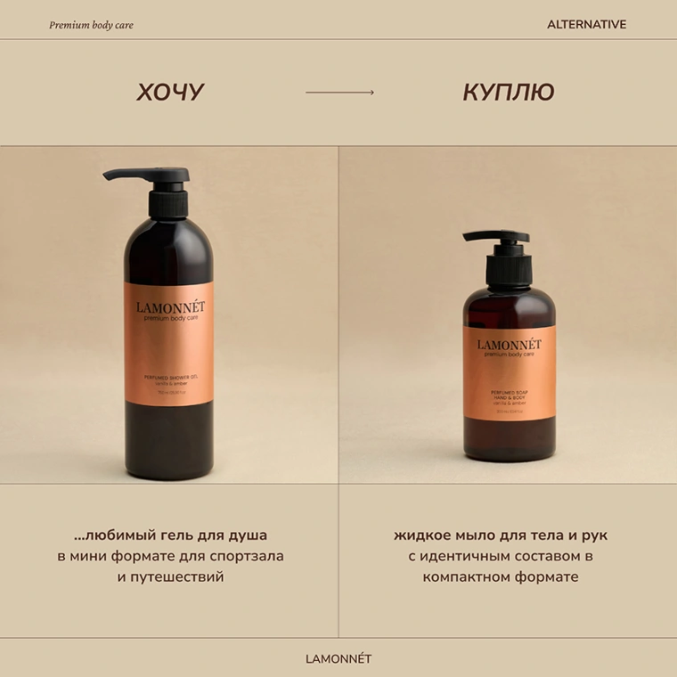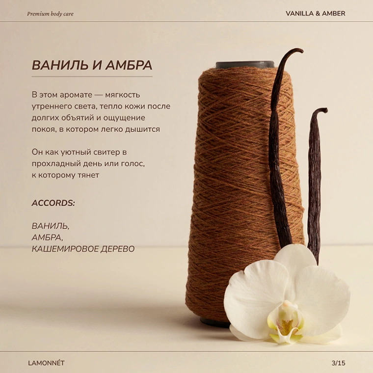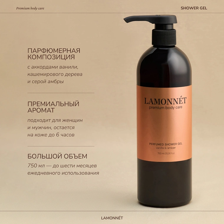 Гель для душа LAMONNÉT с ароматом премиального парфюма vanilla & amber — это авторский продукт, с особым вниманием и страстью разработанный именно для вас.