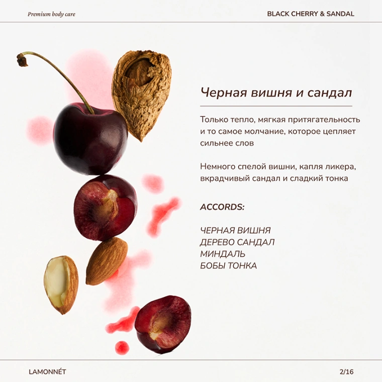 Гель для душа LAMONNÉT с ароматом премиального парфюма black cherry & sandal — это авторский продукт, с особым вниманием и страстью разработанный именно для вас.
