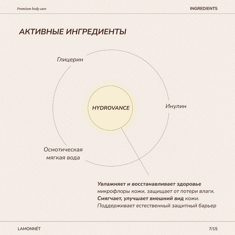 Деликатная формула с ухаживающим комплексом (hydrovance, инулин и глицерин на основе мягкой осмотической воды) и выверенным балансом активных компонентов увлажняет и восстанавливает здоровье микрофлоры кожи, защищает от потери влаги. Смягчает, улучшает внешний вид кожи, а также поддерживает естественный защитный барьер.
