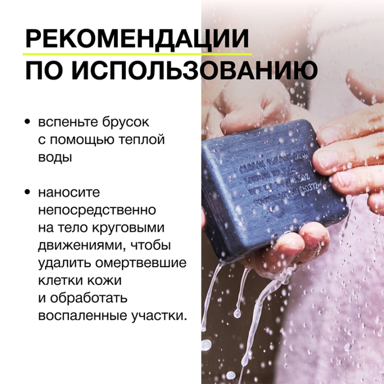 Вспеньте брусок с помощью теплой воды. Наносите непосредственно на тело круговыми движениями, чтобы