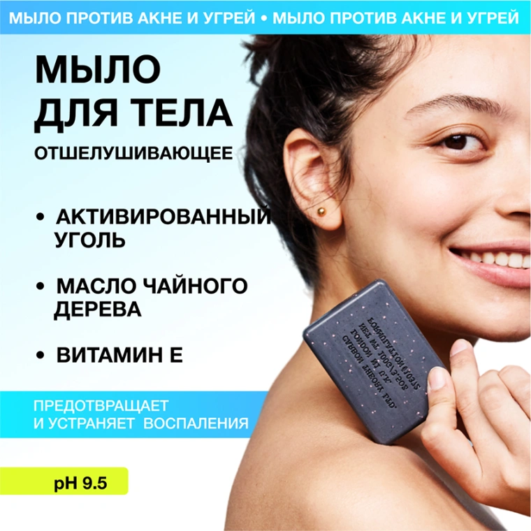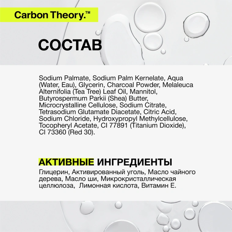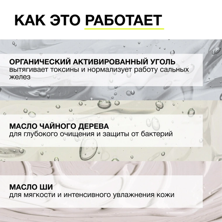 Органический активированный уголь: деликатно абсорбирует бактерии, токсины и излишки себума.