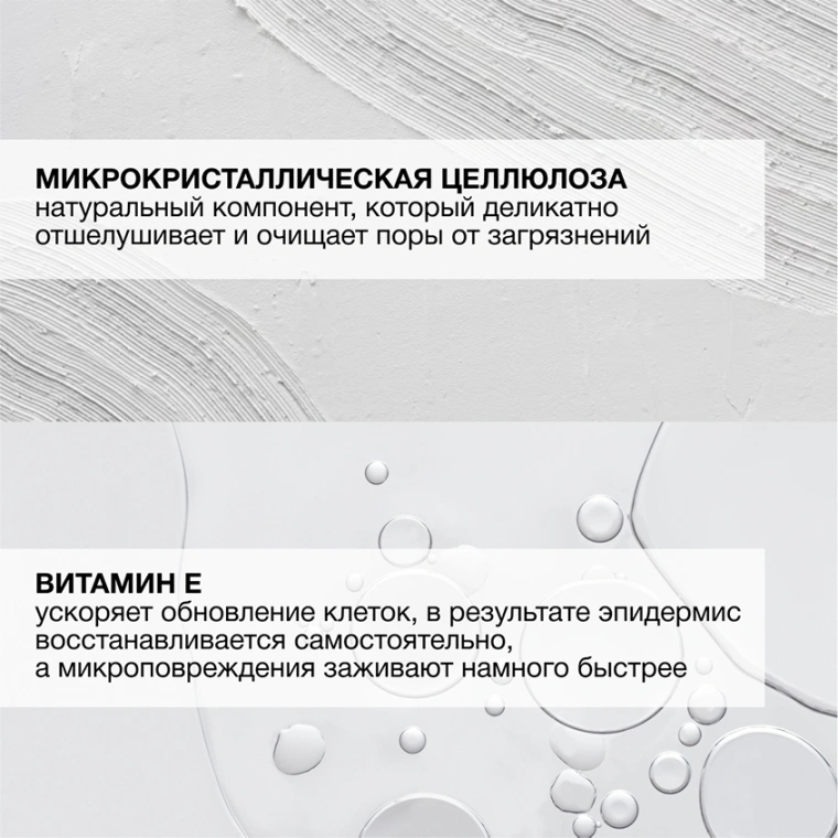 Целлюлоза: натуральный компонент, который деликатно отшелушивает кожу и очищает поры от загрязнений.