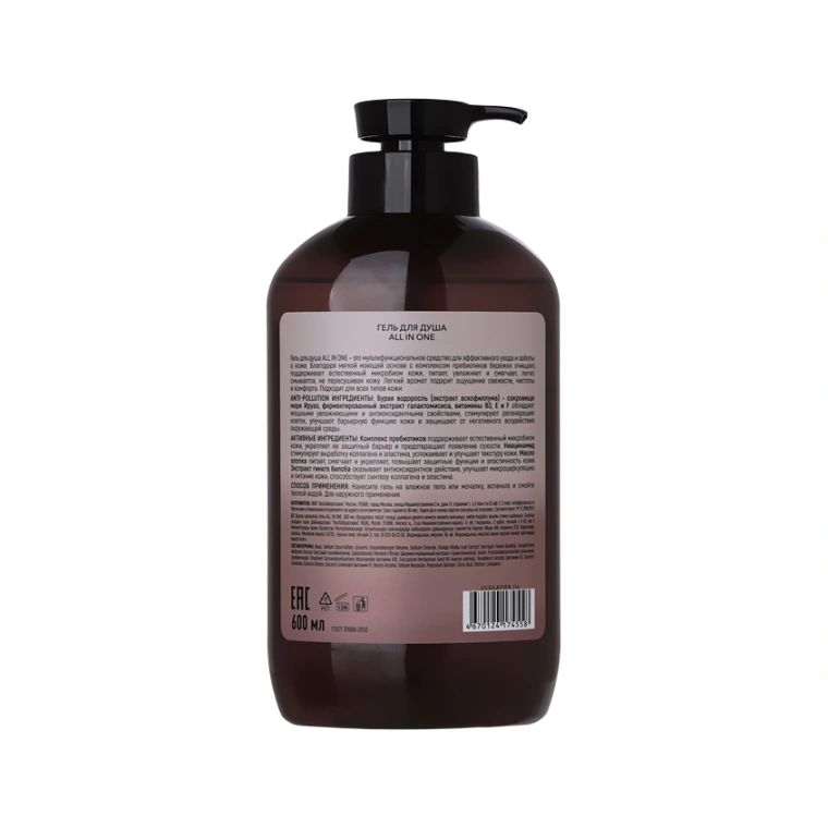 Гель для душа ALL IN ONE – это мультифункциональное средство для эффективного ухода и заботы о коже. Благодаря мягкой моющей основе с комплексом пребиотиков бережно очищает, поддерживает естественный микробиом кожи, питает, увлажняет и смягчает, легко смывается, не пересушивая кожу. Легкий аромат подарит ощущение свежести, чистоты и комфорта. Подходит для всех типов кожи.