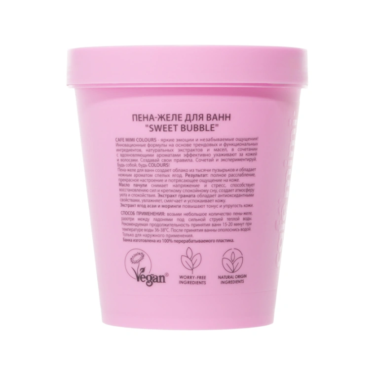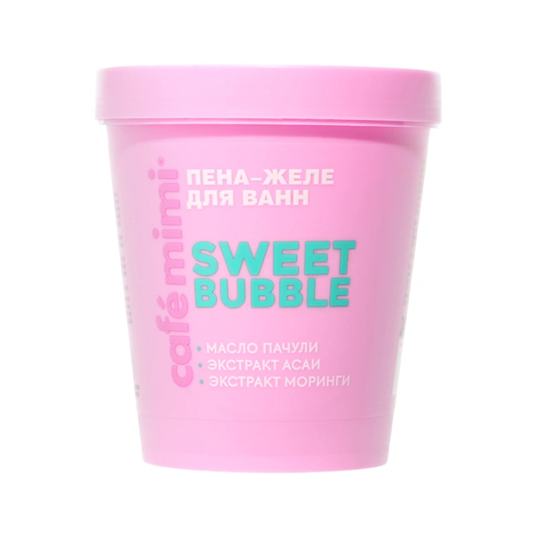 Пена-желе для ванн CAFE MIMI Colours Sweet Bubble мгновенно успокаивает и смягчает. Масло пачули снимает напряжение и стресс, способствует восстановлению. Экстракт граната обладает антиоксидантными свойствами и увлажняет. Экстракт ягод асаи и моринги повышает тонус и упругость. Пена-желе для ванн CAFE MIMI Colours Sweet Bubble имеет воздушную текстуру и дарит коже ощущение свежести.