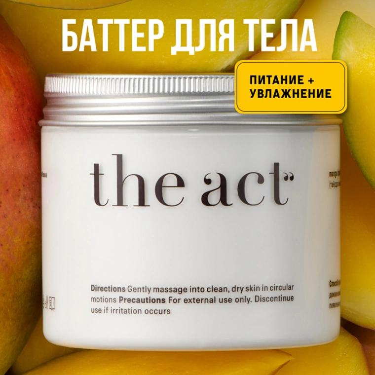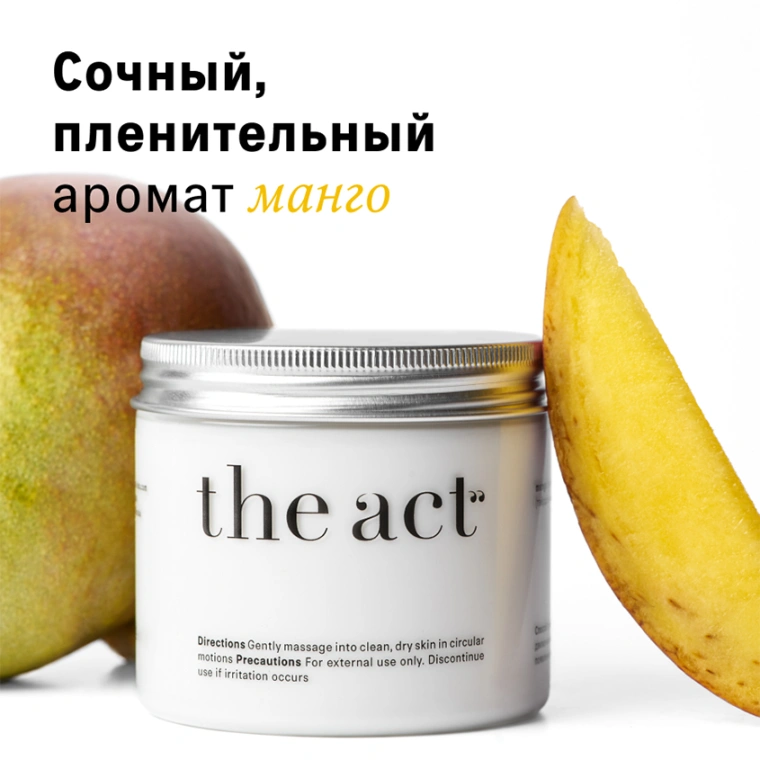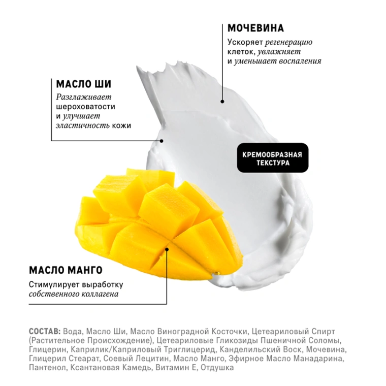 В баттере с манго есть все, что нужно вашей коже. На первом месте — комплекс натуральных компонентов в составе, которые обеспечивают питание, удерживают влагу внутри кожи, ускоряют регенерацию, возвращают упругость и тонус. Далее — нежная тающая текстура, которая делает кожу мягкой и сияющей. И, конечно, аромат манго, благодаря которому баттер так хочется съесть. Но не поддавайтесь этому соблазну — на коже он будет гораздо полезнее.