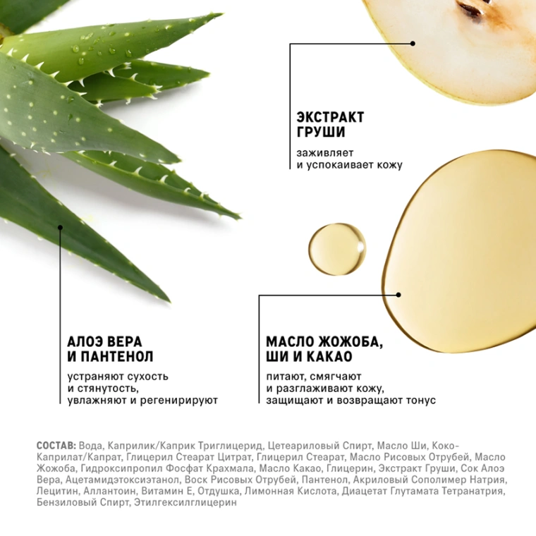Aqua (Water), Caprylic/Capric Triglyceride, Cetearyl Alcohol, Butyrospermum Parkii (Shea) Butter, Coco-Caprylate/Caprate, Glyceryl Stearate Citrate, Glyceryl Stearate, Oryza Sativa (Rice) Germ Oil, Simmondsia Chinensis (Jojoba) Seed Oil, Hydroxypropyl Starch Phosphate, Theobroma Cacao (Cocoa) Seed Butter, Glycerin, Pirus Communis (Pear) Fruit Extract, Aloe Barbadensis (Aloe Vera) Leaf Juice, Acetamidoethoxyethanol, Oryza Sativa (Rice) Wax, Panthenol, Sodium Acrylates Copolymer, Lecithin, Allantoin, Tocopheryl Acetate, Fragrance, Citric Acid, Tetrasodium Glutamate Diacetate, Benzyl Аlcohol, Ethylhexylglycerin