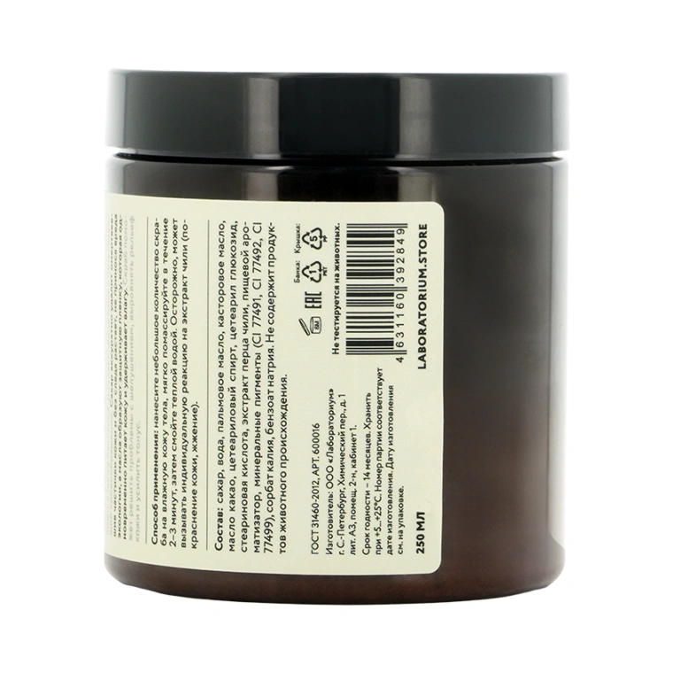 Этот согревающий скраб прекрасно подходит для холодного времени года! Уютный аромат шоколадного маффина и лесного ореха напомнит вашу любимую кофейню - от чашки поднимается пар, за окном солнечное снежное утро, а впереди - поход на каток. Главное - зарядиться теплом, чтобы хватило на весь день. В составе: масло какао и касторовое масло, способствующие питанию и регенерации кожи, а также масляный экстракт перца чили, стимулирующий кровообращение. Сахар аккуратно удалит омертвевшие частички кожи и без следа растает, не принося вреда экологии, а масла образуют защитную пленку, которая одновременно питает кожу и удерживает влагу. Скраб поможет решить проблемы с шелушением, выровнять рельеф кожи и усилить тонус.