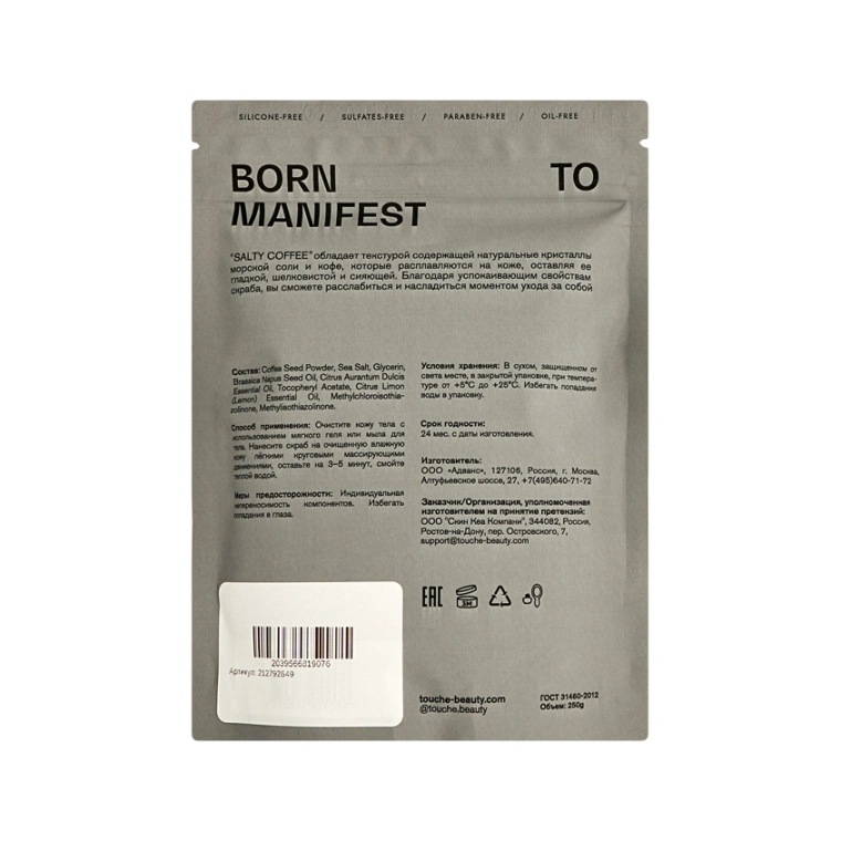 Coffea Seed Powder, Sea Salt, Glycerin, Brassica Napus Seed Oil, Citrus Aurantum Dulcis Essential Oil, Tocopheryl Acetate,