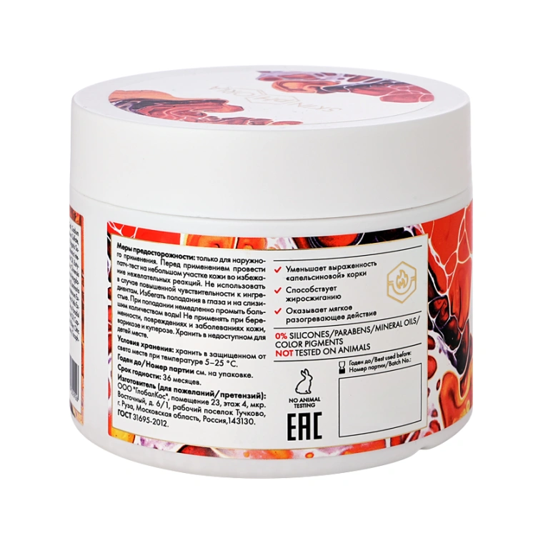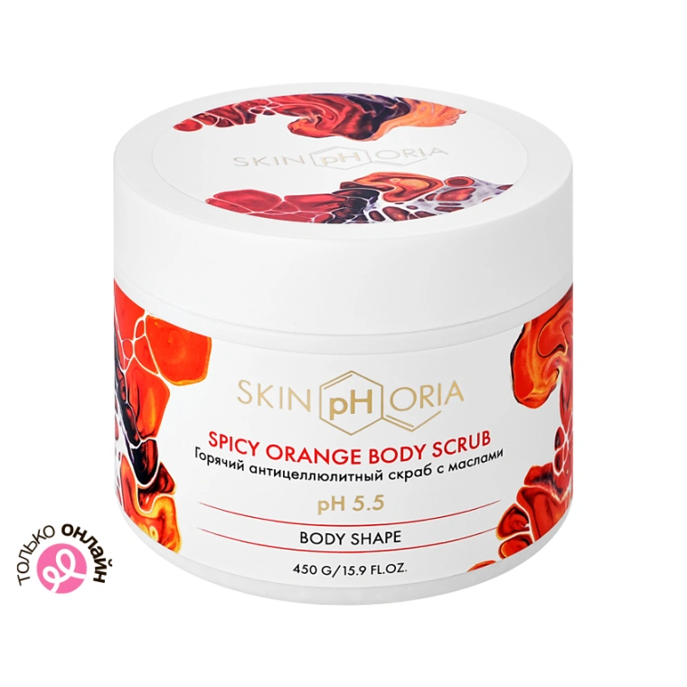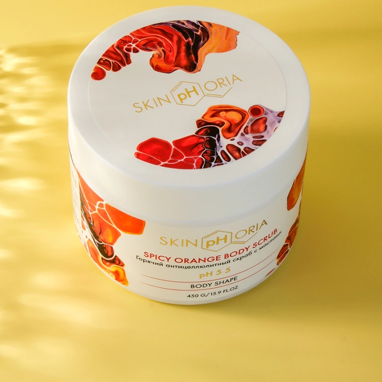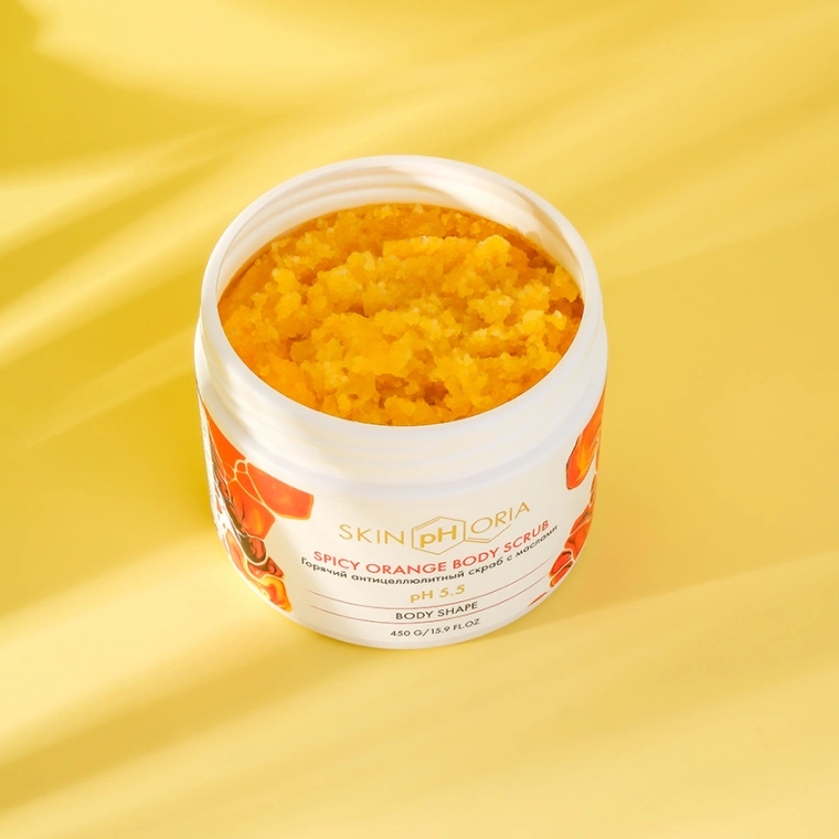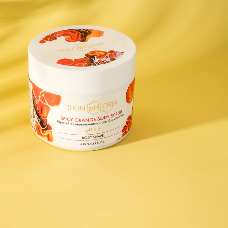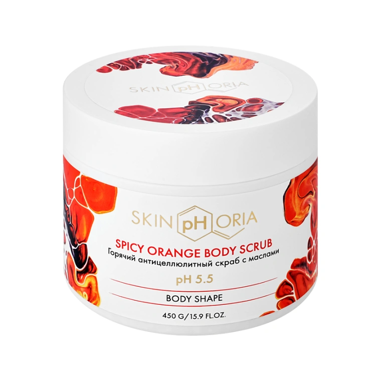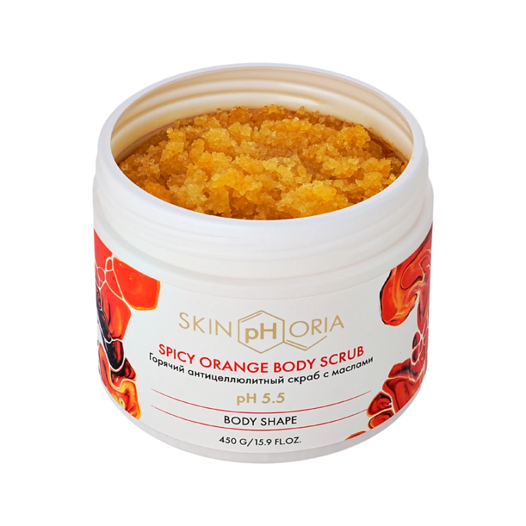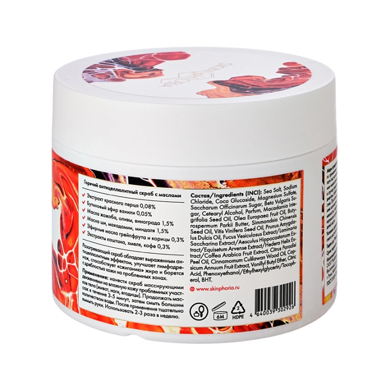 Скраб для тела SKINPHORIA BODY SHAPE антицеллюлитный горячий с маслами деликатно удаляет ороговевшие клетки кожи и загрязнения, способствуя выведению токсинов. Комплекс экстрактов фукуса, ламинарии и красного перца ускоряет циркуляцию крови, стимулируя жиросжигание, способствует его выведению из организма. Морская соль бережно отшелушивает кожу, а экстракт магнезии успокаивает ее и регулирует гидролипидный баланс. Питательные масла глубоко проникают в дерму, увлажняют и восстанавливают защитный барьер, возвращая коже упругость без «апельсиновой» корочки. Регулярное применение скраба уменьшает целлюлит и корректирует фигуру.