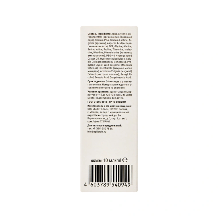 Aqua, Glycerin, Sulfoconcentrol (органически связанная сера), Sodium PCA, Sodium Lactate, Arginine (аргинин), Aspartic Acid (аспарагиновая кислота), PCA, Glycine, Alanine, Serine, Valine, Proline, Threonine, Isoleucine, Histidine, Phenylalanine (комплекс аминокислот), PEG-40 Hydrogenated Castor Oil, Hydroxyethylcellulose, Soluble Collagen (морской коллаген), Propylene Glycol, Wild Bergamot (Monarda fistulosa) Essential Oil (эфирное масло монарды), Artemisia Vulgaris (Mugwort) Extract (экстракт полыни), Benzyl Alcohol, Benzoic Acid, Dehydroacetic Acid.