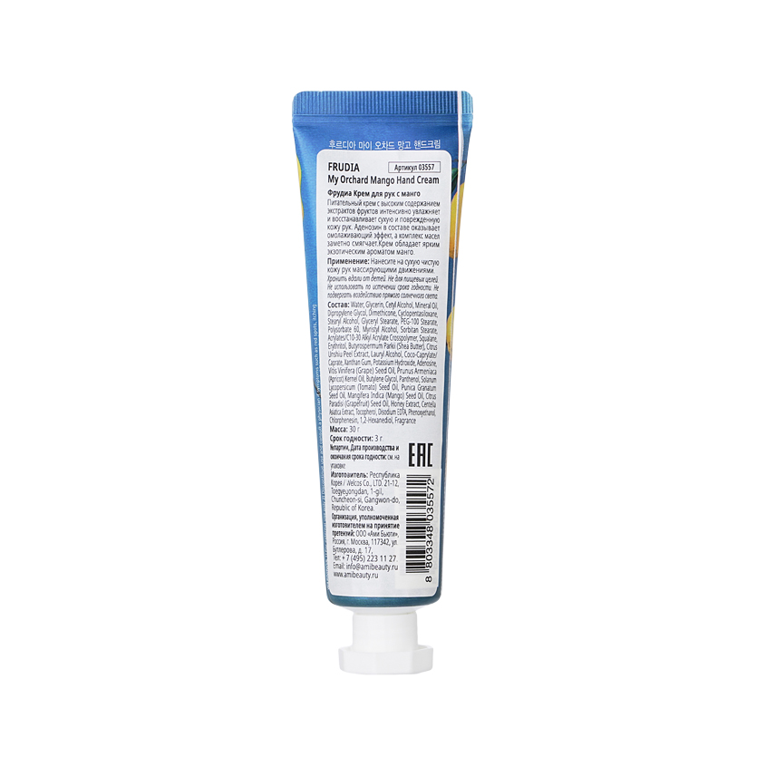 Крем для рук FRUDIA MY ORCHARD MANGO HAND CREAM дарит нежной коже рук комфорт, моментально увлажняет, глубоко питает, смягчает огрубевшие зоны, устраняет сухость и шелушения. Он разглаживает кожу рук, запускает процессы регенерации, уменьшает морщинки и заломы, повышает упругость и эластичность. Крем окутывает кожу приятным ароматом спелого манго, поднимает настроение и заряжает положительными эмоциями на весь день. В состав крема входит масло ши, которое известно своими регенерирующими и омолаживающими свойствами, поможет смягчить и напитать кожу. Аденозин помогает повысить упругость кожи и ускоряет синтез коллагена. Комплекс масел поможет укрепить иммунитет эпидермиса, оздоровить микробиом, улучшить защитные функции кожи. Витамин Е помогает поддерживать уровень влаги в коже, делает ее гладкой и шелковистой. Растительные экстракты освежают кожу, придают ей тонус, насыщают полезными веществами и витаминами, способствуют скорейшему заживлению ранок и повреждений.