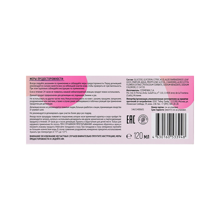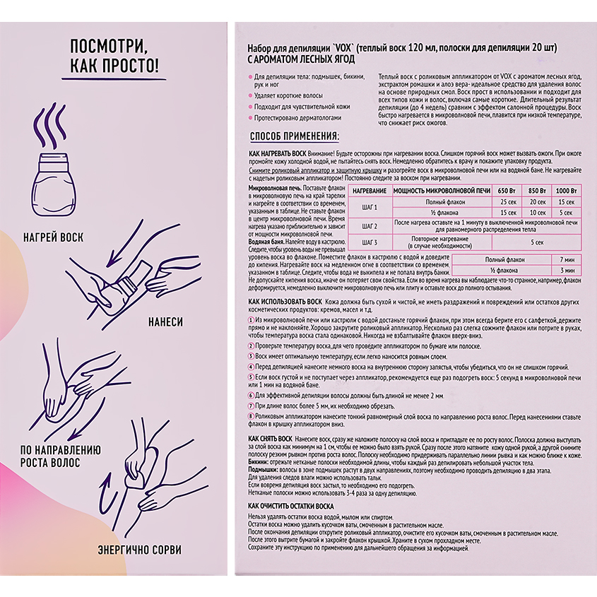 Данный продукт предназначен для депиляции ног, подмышек, бикини и рук. Не использовать на других частях тела. Нельзя использовать на коже с ранами, прыщами, трещинами, раздражениями или ожогами, а также в случае ранее наблюдавшихся побочных реакций при применении продуктов для депиляции. Депиляция воском не рекомендуется пожилым людям, больным диабетом и лицам, принимающим лекарства от угревой сыпи. Не рекомендуется депилировать один участок более двух раз подряд.