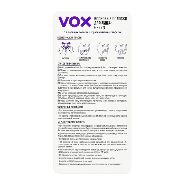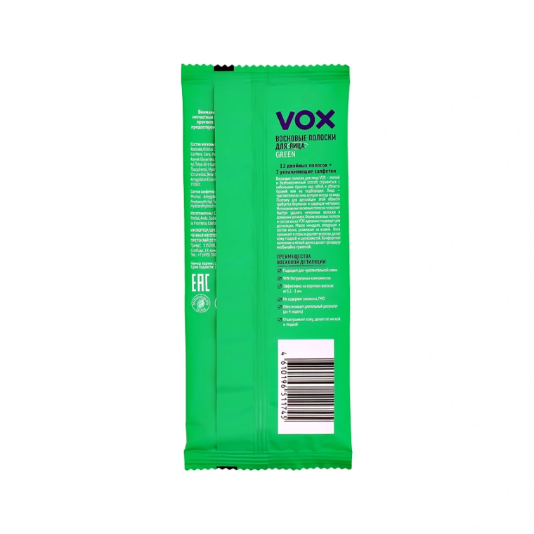 Восковые полоски для лица VOX GREEN — легкий и безболезненный способ справиться с небольшим пушком над губой, в области бровей или на подбородке. Лицо — чувствительная зона, которая всегда на виду. Поэтому для депиляции этой области требуется бережная и щадящая методика. Использование восковых полосок позволяет быстро удалить ненужные волоски в домашних условиях. Форма восковых полосок и состав воска VOX идеально подходят для депиляции. Воск проникает в поры и эффективно удаляет волоски (1.5−3 мм), делая кожу гладкой и шелковистой. Содержит 98% натуральных компонентов. Масло миндаля, входящее в состав воска, ухаживает за кожей. Комфортное нанесение и легкий аромат делают процедуру необычайно приятной. Подходят для чувствительной кожи. Не содержат силикона, ГМО. Отшелушивают кожу, делают ее мягкой и гладкой. Обеспечивают длительный результат до 4 недель.