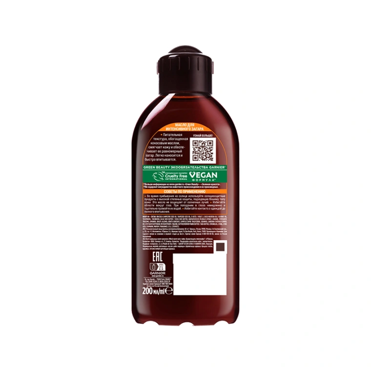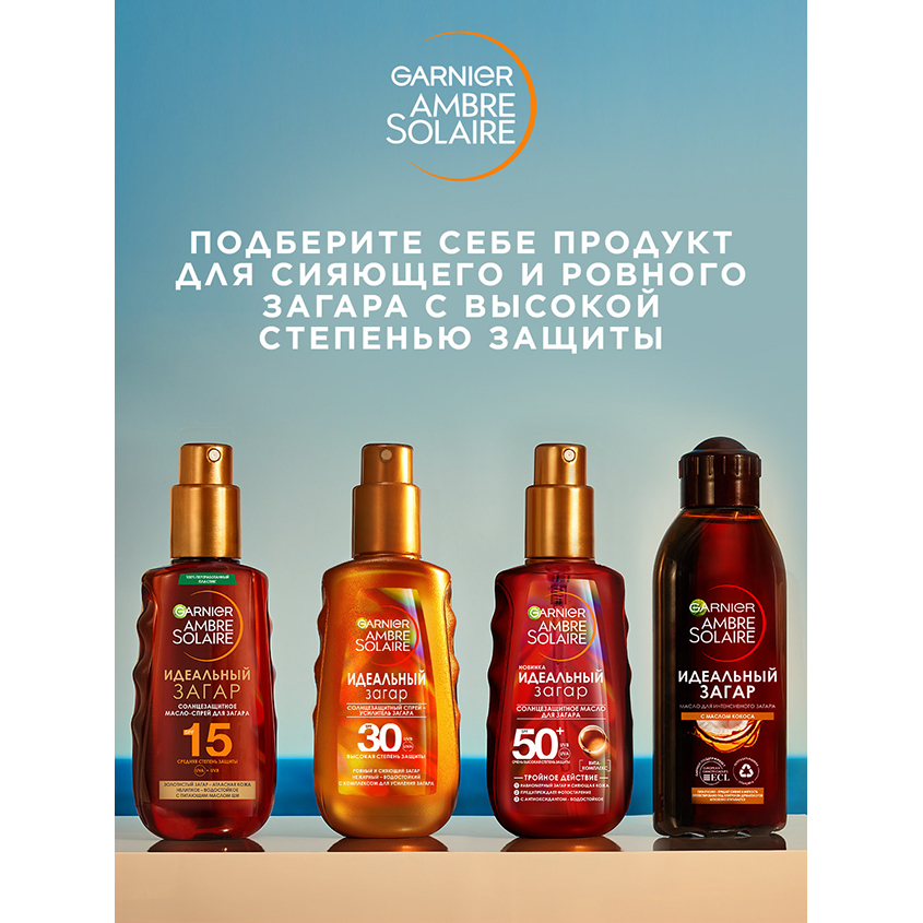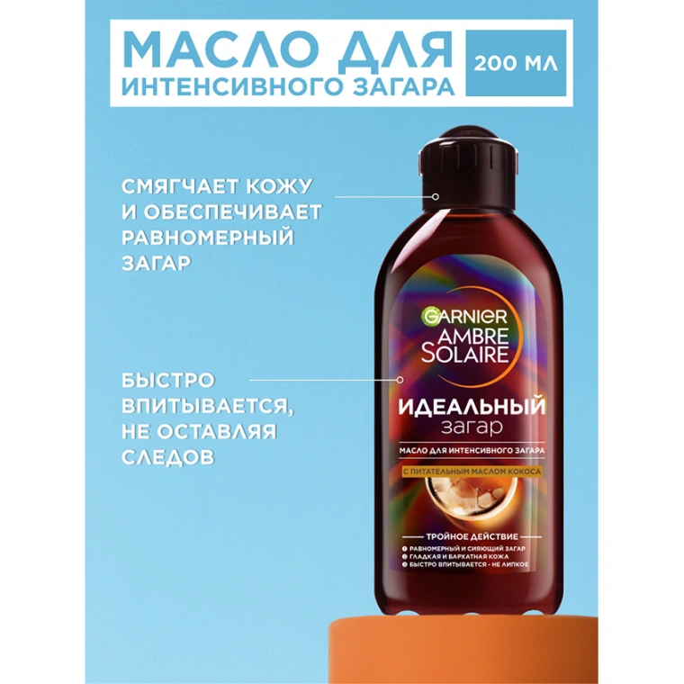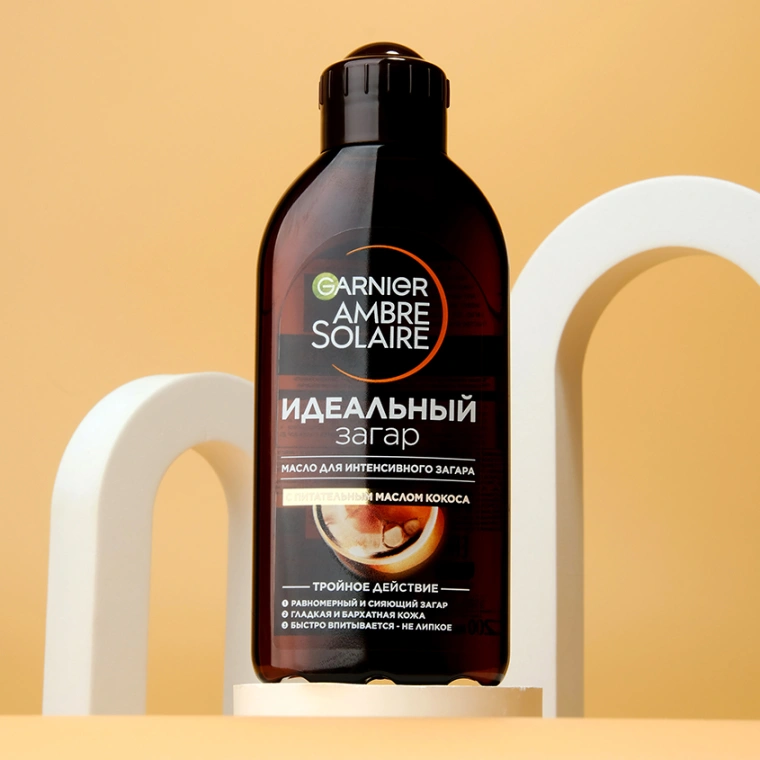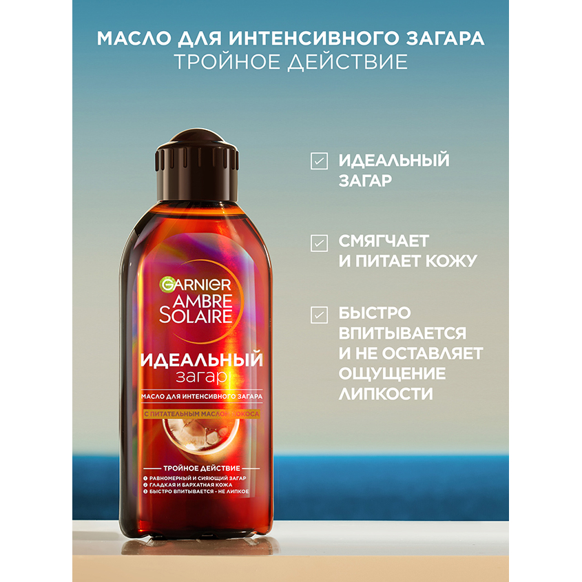 Garnier Ambre Solaire стремится предоставить вам надежную защиту от солнца c 1935 года. Мы также обязуемся заботиться о вашей коже с помощью нашего масла для интенсивного загара. Оно питает и смягчает кожу, одновременно придаёт ей сияние, необычайную мягкость и по-летнему приятный кокосовый аромат. Подходит для тех, кто желает приобрести более интенсивный загар. Масло для интенсивного загара, популярное среди любителей солнца, создано на основе питательной формулы и очень удобно в использовании.